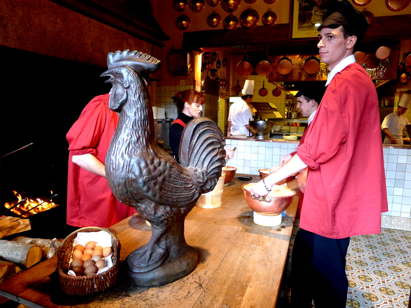 En entrant, on peut voir – et surtout entendre – quatre marmitons battre des oeufs en cadence dans la cuisine ouverte. Le spectacle est assez impressionnant et met aussitôt en appétit.