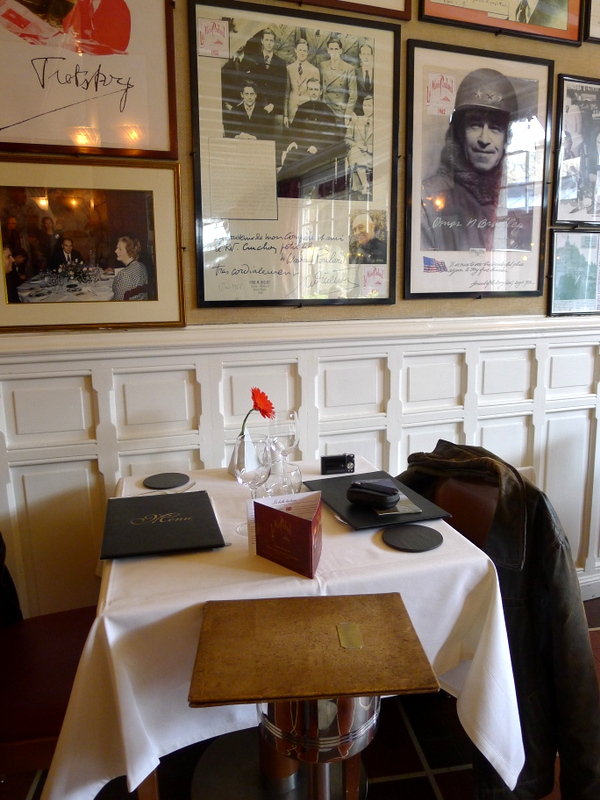 Pour le dessert comme pour l’entrée, trois trios sont proposés: chocolat, sorbet ou pomme. Rien à redire à cette dernière, à part qu’une fois de plus, il n’y a pas de quoi attraper une indigestion. Pour 45€, plus 7€ le verre de cidre, j’avoue que l’addition me fait grincer des dents. Oui, la salle est jolie (et décorée des portraits de clients célèbres: j’ai mangé sous un détonnant triptyque Sarkozy-Trotsky-Mitterrand/Thatcher); oui, le service est irréprochable. Mais payer un repas ce prix-là et finir devant une salade McDo à 17h pour cause d’estomac qui crie famine, désolée, ça ne passe pas. Du tout.