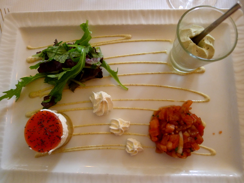 En entrée, nous avons le choix entre trois trios: poisson, campagne ou végétarien. J’opte pour ce dernier. C’est joliment présenté, mais il n’y a rien à manger et tout (émincé de tomates, mousse d’avocat, terrine de petits légumes) est assez quelconque.