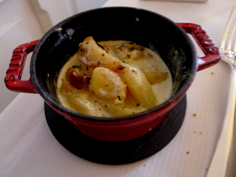 Arrive la fameuse omelette. Elle est énorme… mais pleine d’air et de rien d’autre. Oui, pour 25€, le client de la Mère Poulard a droit à une omelette à la texture certes d’un mousseux inédit, au fumet certes délicieux de feu de bois, mais totalement nature. Je n’ose même pas calculer la marge pratiquée par l’établissement sur le prix de l’oeuf. Oh, il y a bien, avec ça, une minuscule cocotte de pommes de terre à la crème, mais en quantité à peine suffisante pour boucher une dent creuse. Je suis déception et amertume.