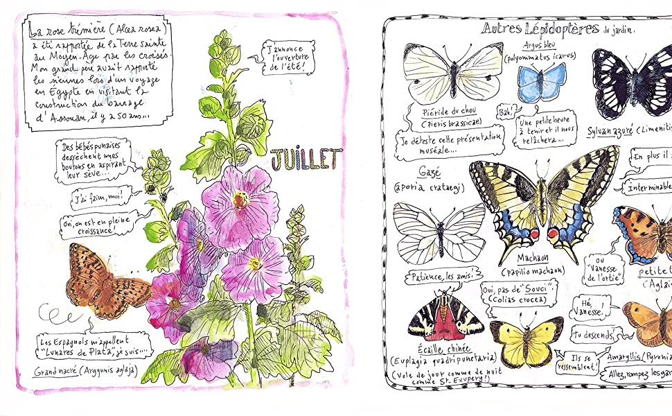 J’ai vu passer plusieurs des pages de ce « Carnet d’un voyageur immobile dans un petit jardin » sur son compte Instagram et j’étais impatiente de découvrir le résultat final. Ma surprise a été grande quand la libraire m’a tendu un énorme album carré et épais, qui devait bien peser dans les deux kilos – un très bel objet avec ses pages épaisses et son marque-page tissé. L’auteur y retranscrit les observations faites de février 2018 à mai 2019 sur le terrain de 700 mètres carrés qui entoure sa vieille maison en Bourgogne. Fleurs et arbres, oiseaux et insectes: rien n’échappe à sa curiosité de jardinier enthousiaste. Ses dessins sont accompagnés de commentaires instructifs ou humoristiques, entrecoupés d’extraits de poèmes qui parlent de la nature et de portraits de leurs auteurs. Une vraie bouffée d’air pur qui se savoure à petites doses pour faire durer le plaisir, et vers laquelle même une citadine endurcie comme moi sait qu’elle aura plaisir à revenir.