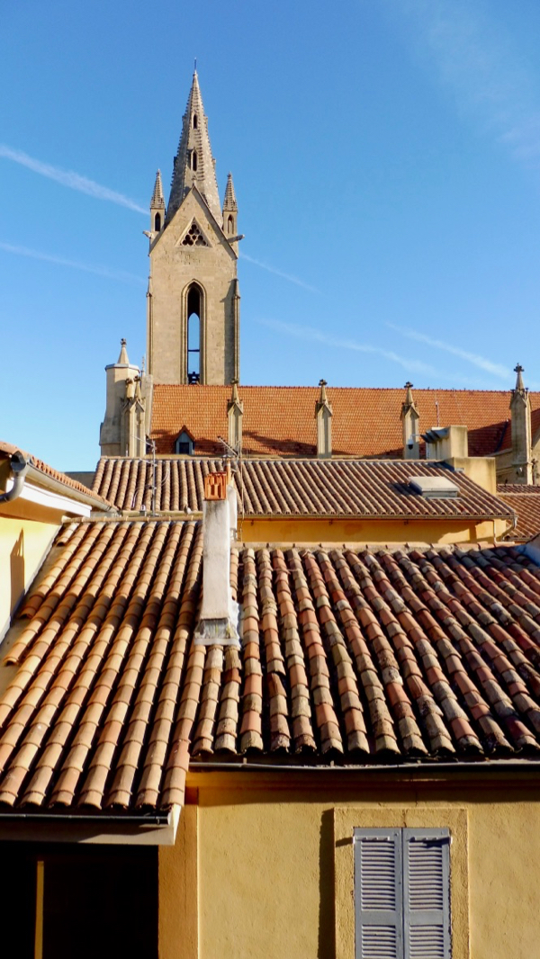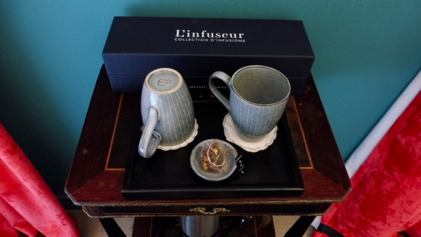 Parfois les photos d’hôtels sont trompeuses et on est déçu en arrivant sur place. Ca n’a pas été le cas cette fois. Je me suis aussitôt sentie comme chez moi dans cette chambre pleine de caractère, mélangeant avec audace trouvailles vintage et équipements ultra-modernes. J’ai apprécié la superbe vue sur les toits d’Aix, les spectaculaires rideaux en velours rouge et les estampes japonaises groupées dans un coin, mais aussi les attentions délicates des propriétaires: bouteilles d’Evian sur les tables de chevet, calissons et nougat locaux sous cloche en verre, coffret de tisanes, tasses et bouilloire pour l’infusion du soir… L’hôtel ne sert pas de petit déjeuner en ce moment, mais le lendemain matin, des viennoiseries toutes fraîches ainsi qu’une sélection de thés et de cafés gracieusement offerts m’attendaient à la réception.