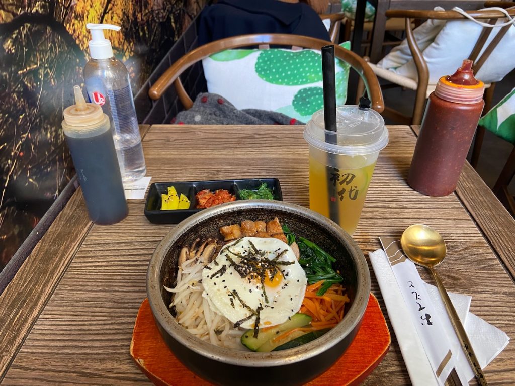 Outre les délices sucrées qui ont fait sa réputation, le Shodai Matcha propose quelques plats chauds parmi lesquels j’ai été agréablement surprise de trouver des bibimbaps (d’origine coréenne, tandis que le matcha vient du Japon). Bonheur: ils sont servis dans le fameux bol en fonte où le riz continue à cuire jusqu’à former une croûte croquante dans le fond. Miam. En accompagnement, j’avais choisi un thé glacé à l’aloé vera avec l’option « demi-dose de sucre » disponible pour toutes les boissons. Il était absolument divin, parfumé et rafraîchissant – mais surtout, dépourvu des atroces perles de tapioca molles et gluantes qui caractérisent les bubble teas. J’ai noté le gobelet à petit bouchon, hyper pratique pour emporter sa boisson sans en mettre partout, mais je savais déjà qu’il ne resterait pas une seule goutte de la mienne le temps que je reparte.
