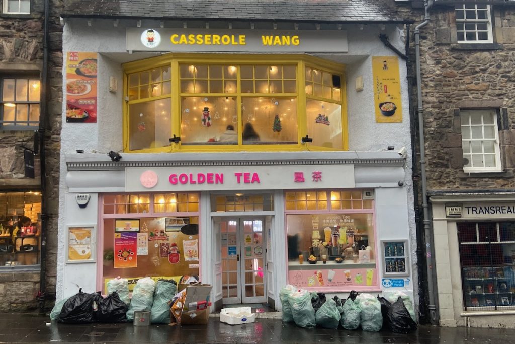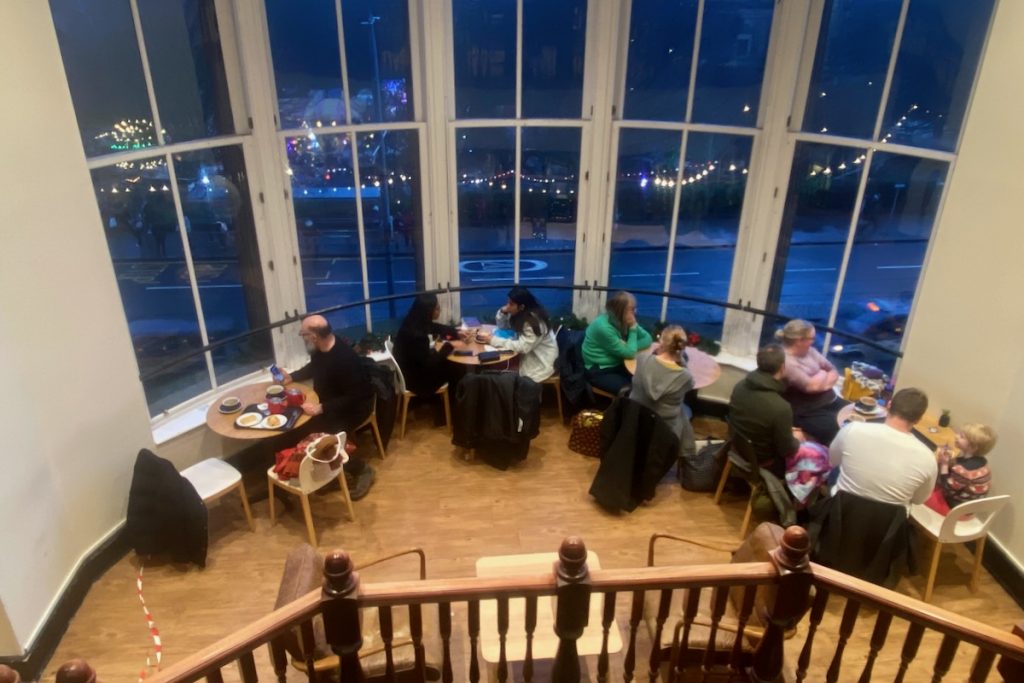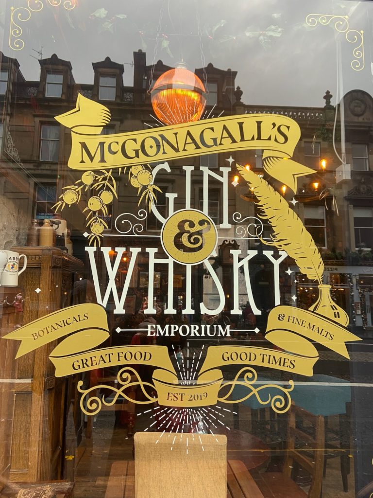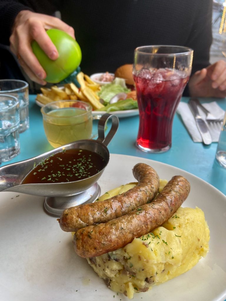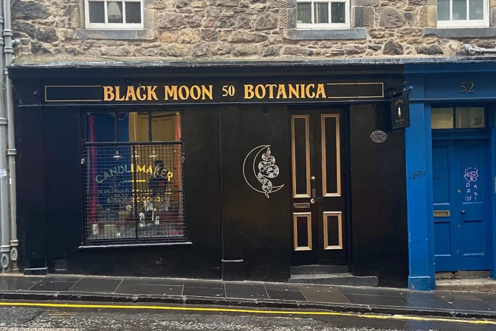 Il est maintenant l’heure de déjeuner. Nous remontons vers chez MUMS comfort food, une chaîne écossaise connue notamment pour ses bangers & mash (des saucisses-purée, donc, mais délicieuses). Nous passons devant Black Moon Botanica, une boutique de « sorcellerie » repérée sur Instagram et malheureusement fermée jusqu’au 11 janvier. Des mois que je dressais amoureusement une liste de tous les accessoires que je souhaitais acheter sur place pour m’éviter les frais de port et de douane; je suis désespoir. Pour me venger, au lieu du plat végétarien raisonnable sur lequel j’avais porté mon choix, je m’entends réclamer à la serveuse de chez MUMS deux saucisses aux herbes avec une purée à l’ail et aux champignons et une sauce brune traditionnelle. Plus un soda à la rhubarbe. Le gras et le croustillant, y’a que ça de vrai pour éponger la déception.