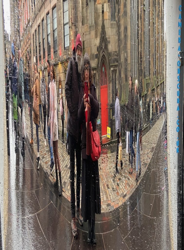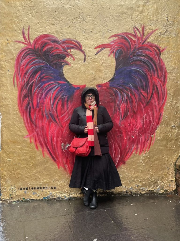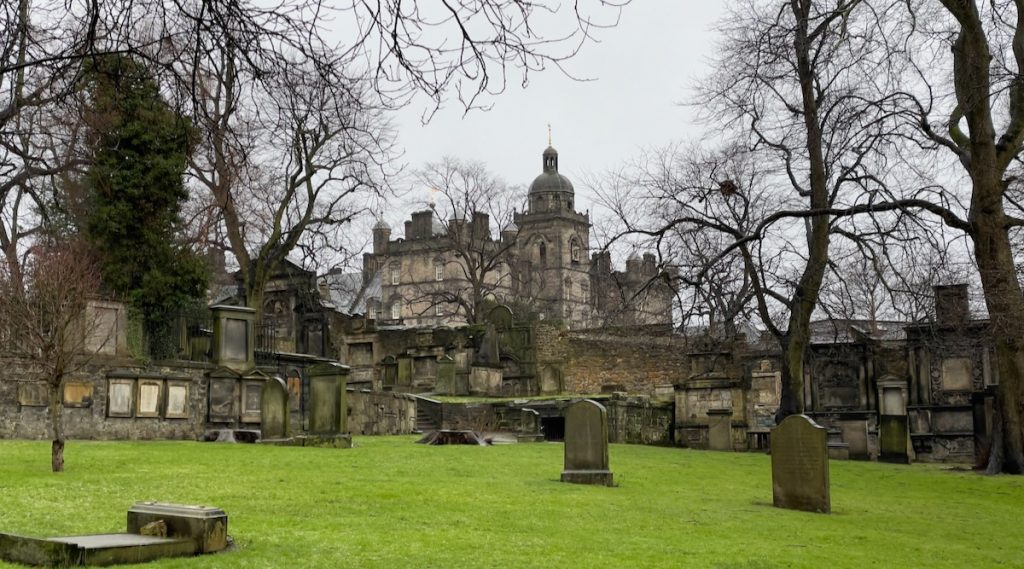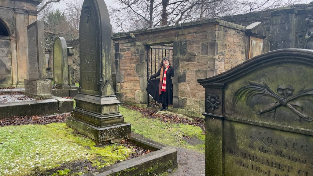 Lorsque nous ressortons, la pluie s’est changée en neige légère, qui ne tiendra sans doute pas mais que j’apprécie quand même. Une météo intéressante pour explorer le cimetière de Greyfriars, dont nous avions fait une visite guidée assez pittoresque en 2016. Il est néanmoins plus petit que dans mon souvenir; je n’y vois pas des tas d’endroits où poser en étant à la fois un peu protégée et respectueuse du lieu. La seconde opération-éclair de la journée ne donne pas d’aussi bons résultats que la première, mais c’est le jeu, ma pov’ Lucette. Parfois on obtient un résultat miraculeux, et parfois on est juste déçu. Un peu comme dans toute entreprise créative, en somme.
