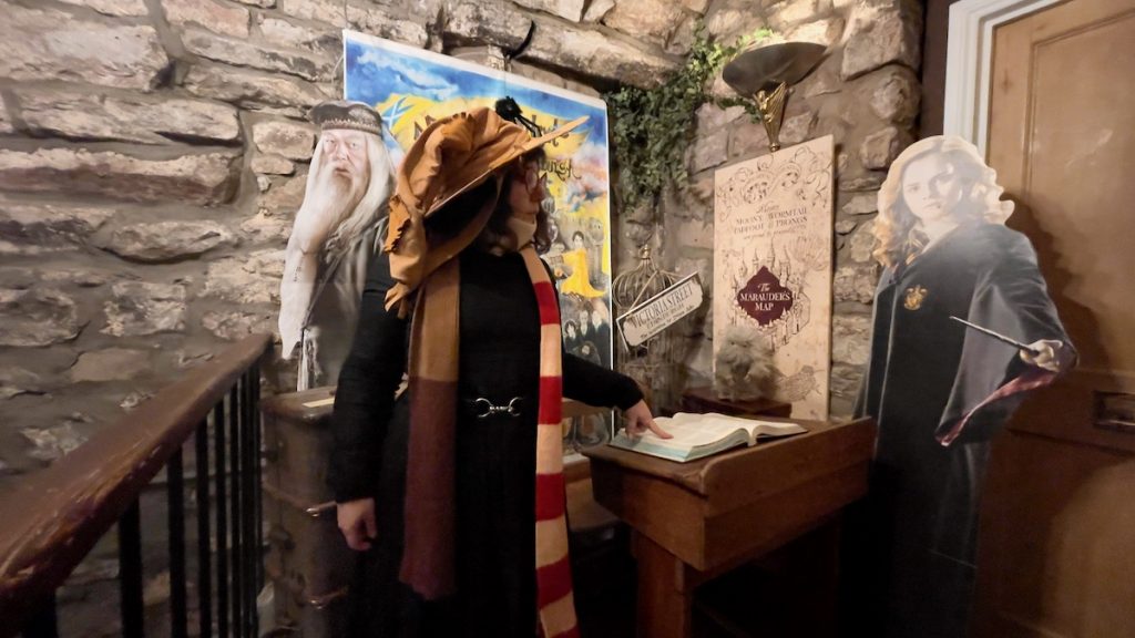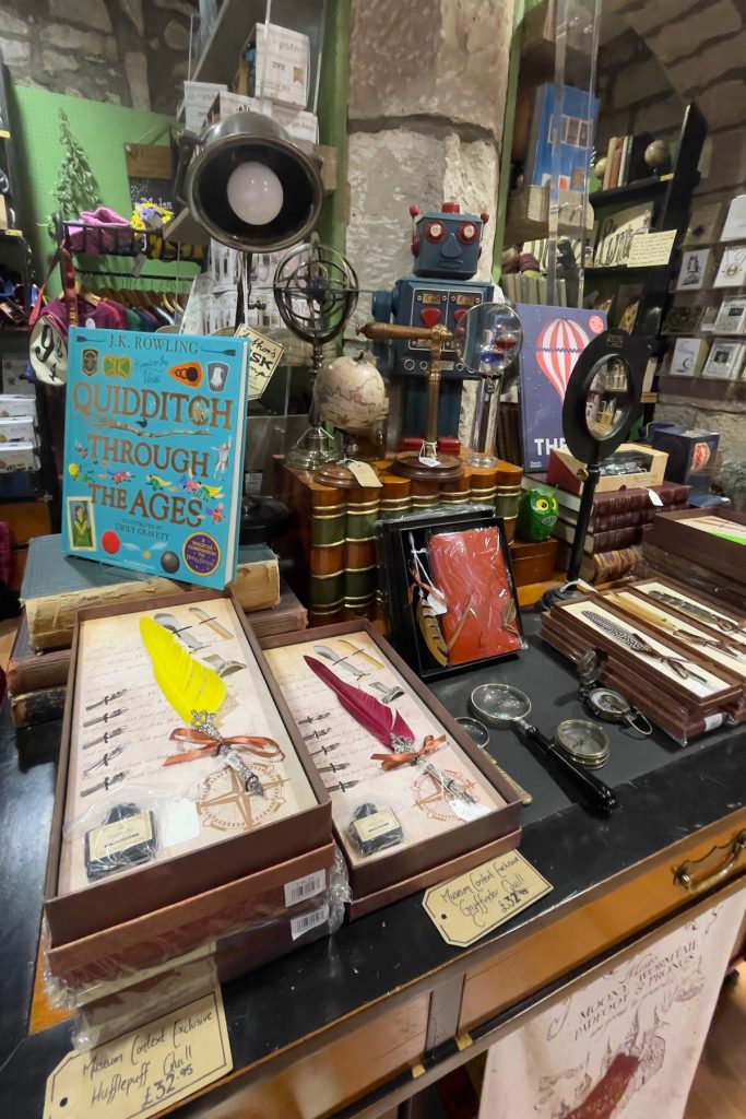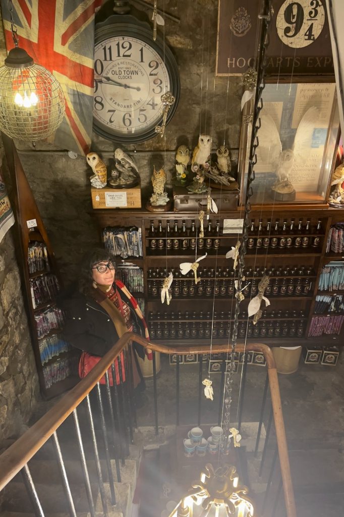 Sur le chemin de notre arrêt suivant, je ne résiste pas au plaisir de remonter Victoria Street juste pour le fun. Et comme la pluie redouble d’intensité, je décide qu’on va s’abriter chez Museum Context, une boutique Harry Potter sur plusieurs étages, tarabiscotée, exiguë et hyper encombrée mais bourrée d’objets irrésistibles. Si j’étais prête à le trimballer pendant tout le reste de la journée, je craquerais sur le dernier chaudron ouija qui ferait un merveilleux accessoire pour un shooting sorcière en intérieur. Pour une fois, ma flemme me sauve!