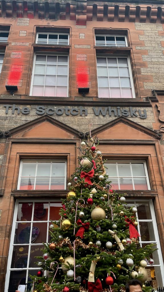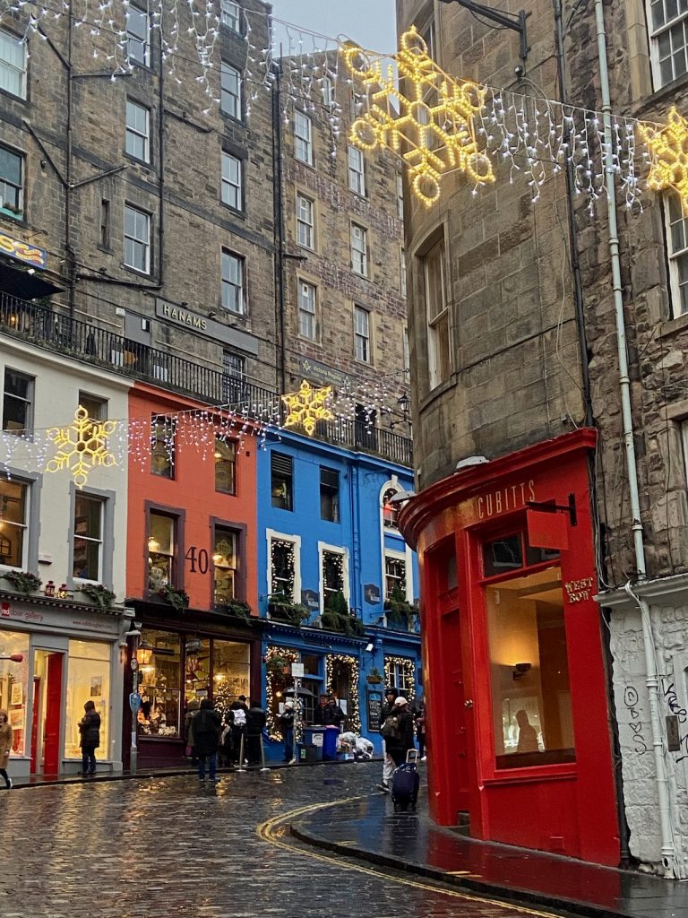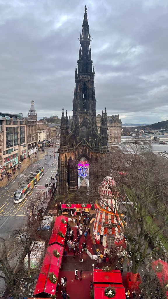 Nous descendons ensuite vers New Town. Au passage, je propose à Chouchou de faire un tour sur la grande roue du marché de Noël: étant donné l’éclairage public réduit pour faire des économies, on profitera mieux de la vue en plein jour. Et puis, la file d’attente est bien moindre que le soir. D’en haut, je suis surprise de constater à quel point la mer est proche à vol d’oiseau. S’il faisait meilleur et si on n’avait pas mieux à faire, on pourrait s’y rendre à pied depuis le centre. Tout de même, le panorama est très gris.