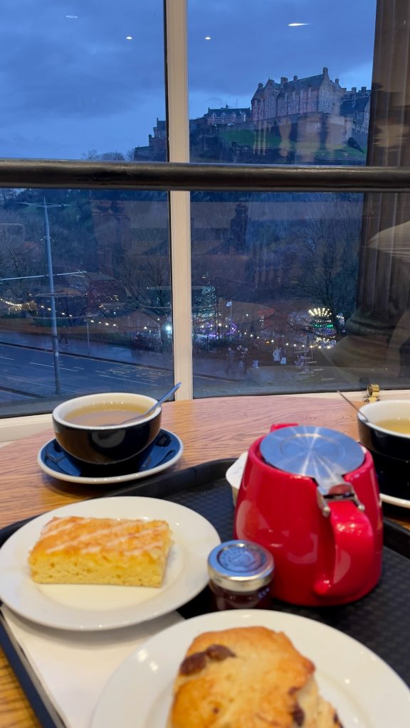 Satisfaite, je décide le moment venu d’aller nous poser dans un de mes endroits préférés au monde: le café du Waterstones de Princes Street. Les dieux du tea time ont décidé de compenser la performance décevante de ceux du shopping; ils font en sorte qu’une des deux meilleures tables de la maison se libère juste à notre arrivée. Nous nous installons donc contre la baie vitrée, avec une vue imprenable sur le château. Nous y passons une délicieuse heure et demie à siroter un thé vert assez mauvais (mais soit, on est au pays du thé noir) en grignotant un gâteau au citron et un scone qui, par contre, tabassent tout.