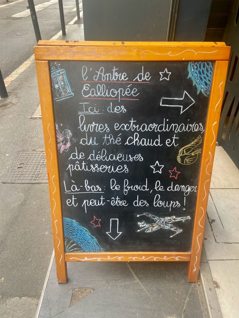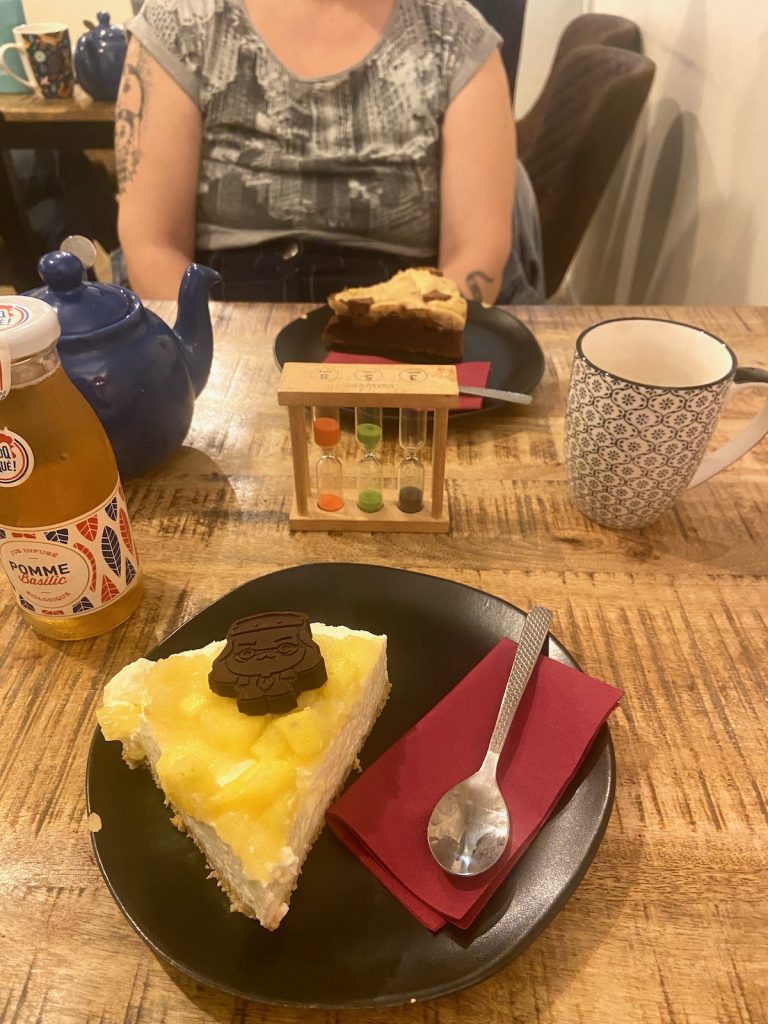 Enfin, nous atteignons l’Antre de Calliopée où je dédaigne courageusement les livres pour me contenter d’un délicieux jus de pomme-basilic et d’un non moins délicieux cheesecake à l’ananas. En revanche, comme je suis fourbe, je persuade Isa d’ajouter « Du thé pour les fantômes » à sa cargaison livresque déjà considérable. Quand nous ressortons, il est 17h, et nous décidons de repasser à l’hôtel poser nos emplettes. Sans vouloir balancer, je suis loin d’être la plus encombrée des deux!