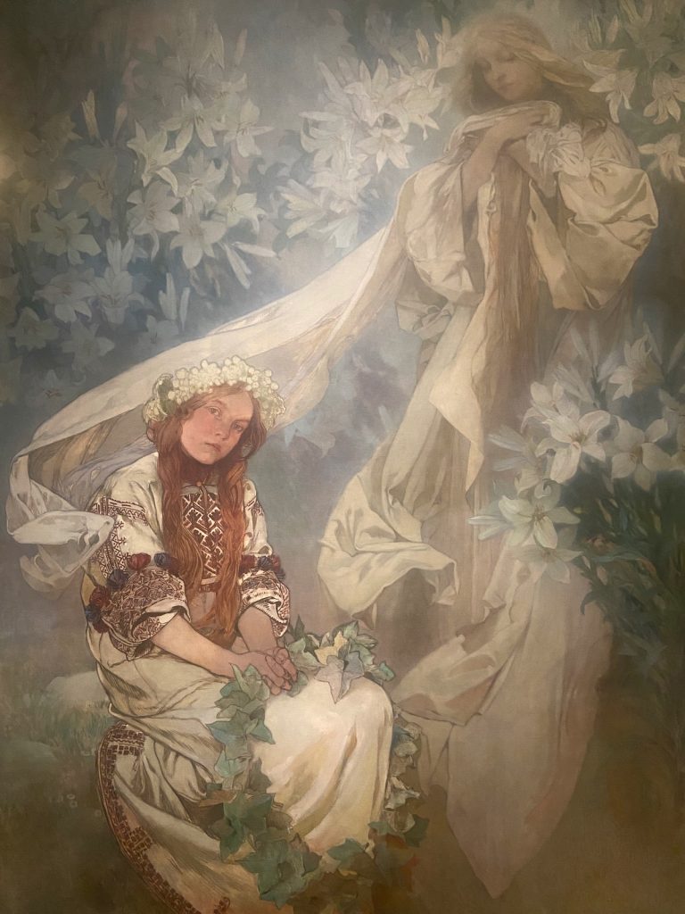 Et l’expo est vraiment très chouette, avec plusieurs pièces dédiés à la deuxième partie de la vie et de la carrière de Mucha, après son retour en Tchéquie et le début de son engagement politique pour le panslavisme. Les oeuvres de cette période contrastent assez fort avec les beautés au teint de lait alanguies parmi les fleurs qui sont ses oeuvres les plus connues. Souvent, on regrette qu’un artiste dont on apprécie le travail soit ou ait été par ailleurs un individu aux valeurs et aux moeurs discutables. Ce n’est clairement pas le cas de Mucha.