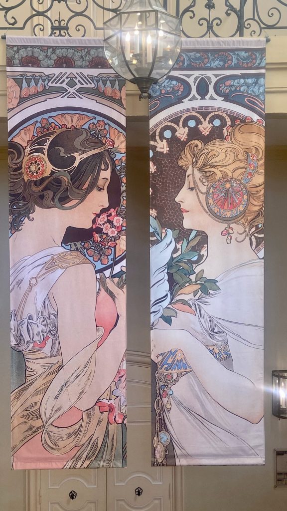 De l’autre côté de la rue, une file impressionnante s’est formée devant l’hôtel de Caumont pour l’expo Mucha qui est dans sa dernière semaine. Grâce aux tickets achetés in extremis sur internet, nous entrons très rapidement et nous mêlons à une foule de visiteurs dont l’âge moyen doit tourner autour de 112 ans. Je n’avais encore jamais vu une telle concentration de cannes de marche au mètre carré. L’avantage, c’est qu’il s’agit d’un public poli et peu bruyant, ce qui m’aide à supporter la densité humaine.