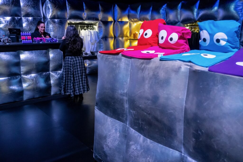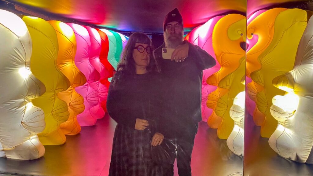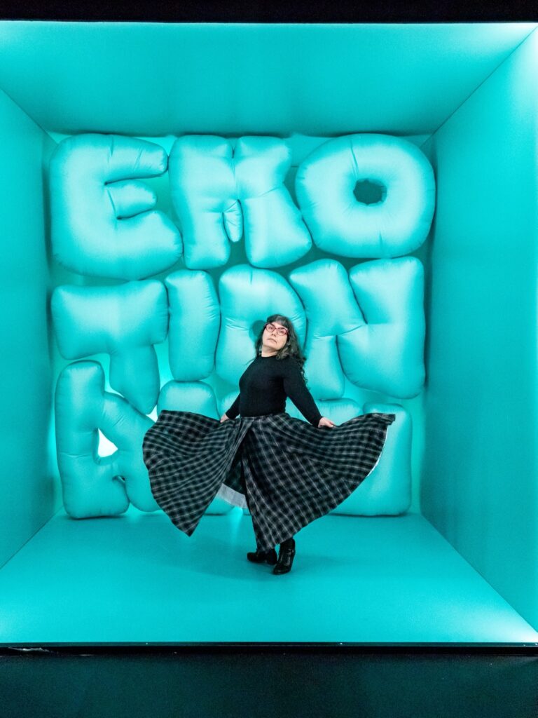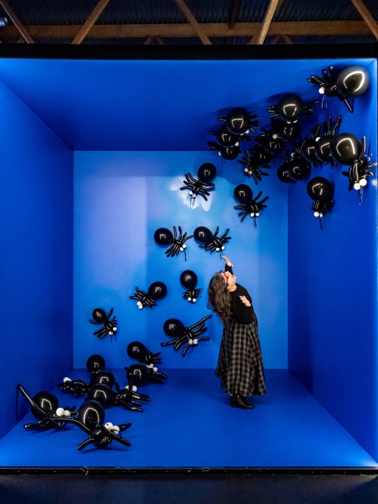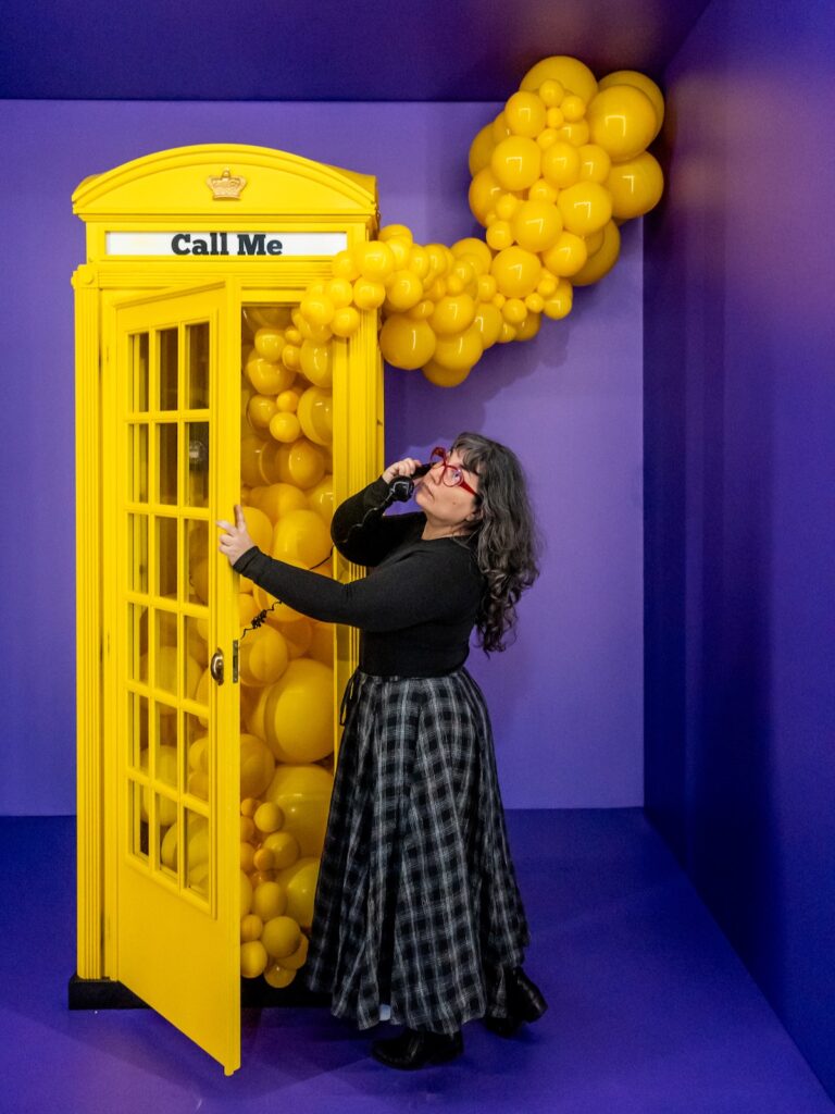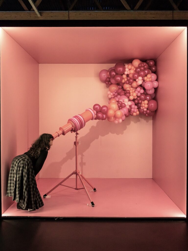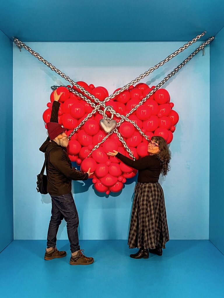 Enfin; nous atteignons la dernière salle avec ses box très visiblement conçus pour Instagram. Nous y retrouvons une cabine téléphonique et un nuage de ballons, mais aussi quelques nouveautés marrantes comme les araignées ou le télescope. Une des employées de l’expo accepte gentiment de nous prendre ne photo avec le coeur enchaîné.