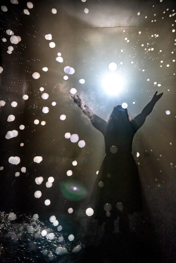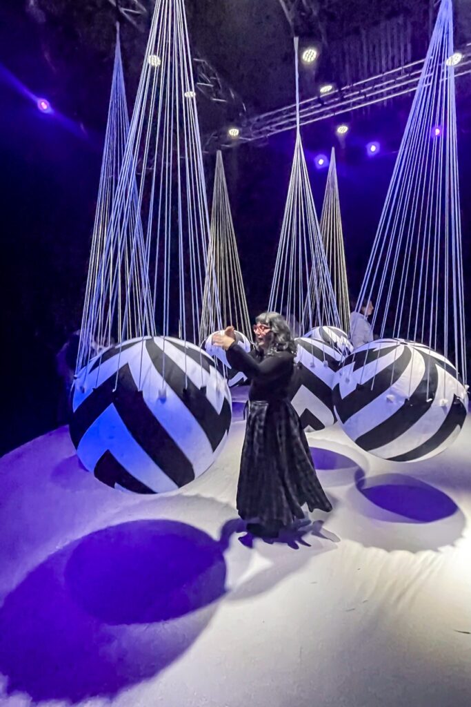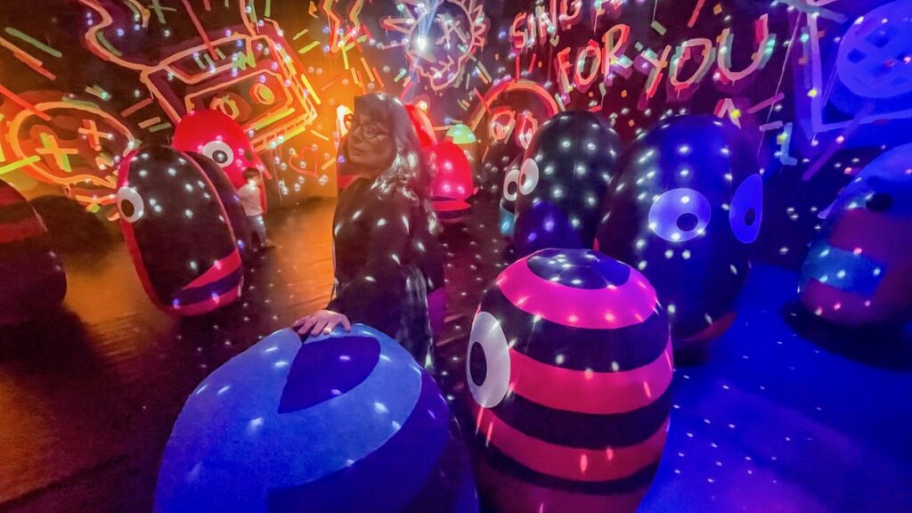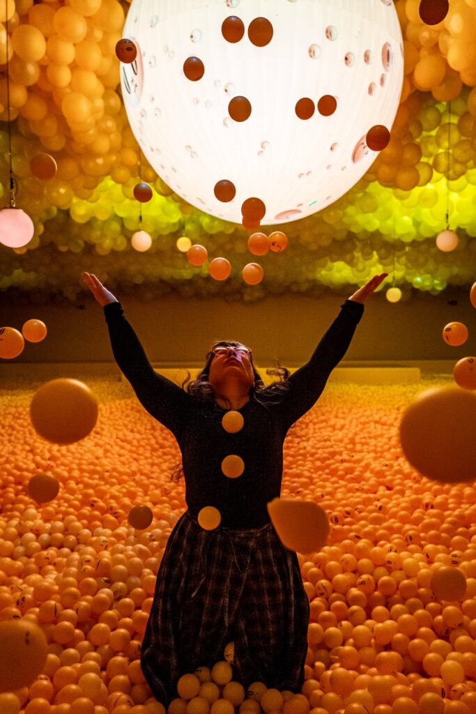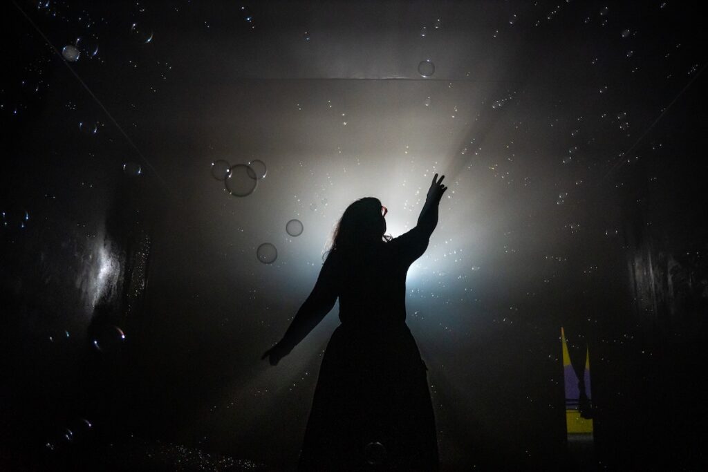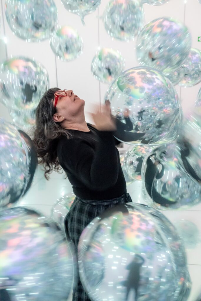 Heureusement, nous finissons par arriver à la piscine à boules. Elle est quasiment vide, ce qui nous permet d’en profiter à fond. La seconde moitié de l’expo se révèle bien plus amusante, et pour cause: c’est pratiquement la même chose que le PopAir qui nous avait plu à Paris. Je passe un long moment à souffler et tenter d’attraper des bulles de savon dans les deux espaces qui leur sont dédiés. Et puis je joue parmi les ballons argentés qu’agite une soufflerie aux directions changeantes jusqu’à ce que la tête me tourne.