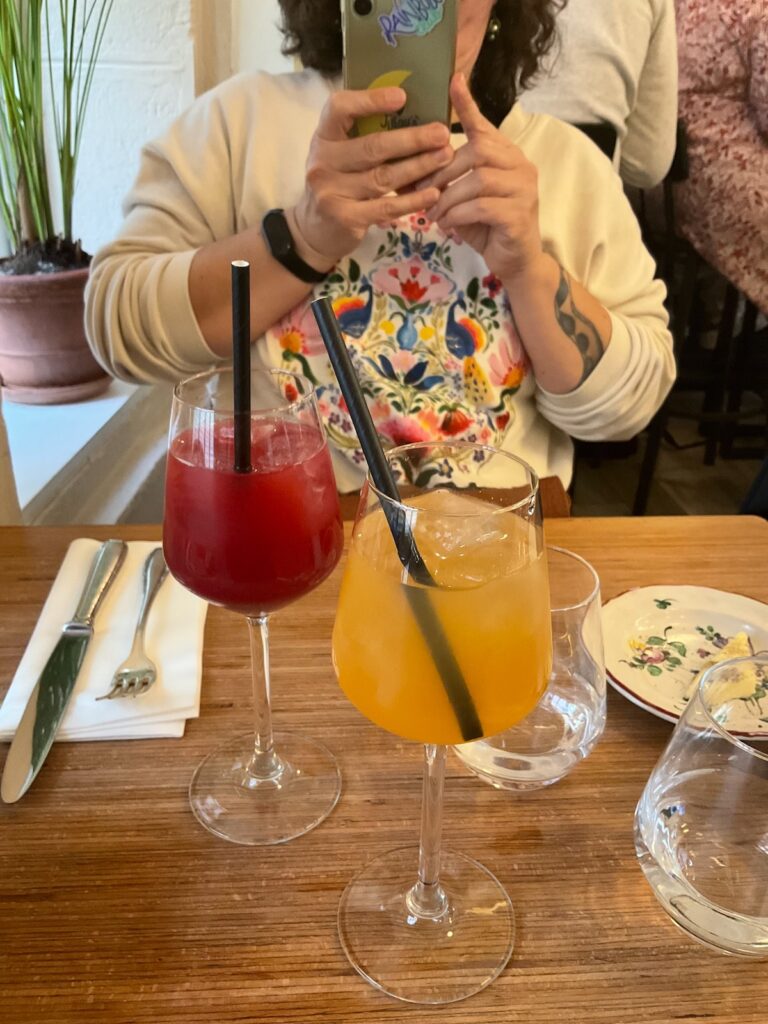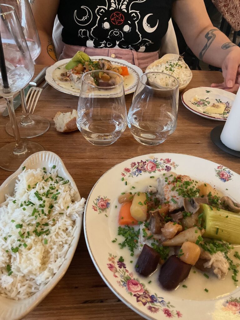 La formule déjeuner est à 24€. Isa opte pour des ravioles de Royan et une blanquette de veau, moi pour une blanquette de veau et un baba au rhum. Tout est absolument délicieux et d’un rapport qualité-prix étonnant pour Paris. La bande-son calée sur la chanson francophone va de Dalida à Mylène Farmer, et les différentes serveuses qui s’occupent de nous sont toutes adorables. Ce n’est pas pour me vanter (si), mais ce resto était un choix inspiré.