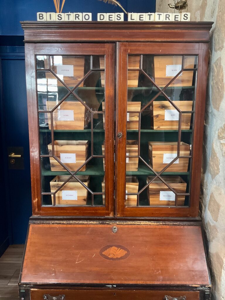 A la fin, je dis à la serveuse que ce qui m’a attirée ici, c’est d’avoir lu qu’à la fin du repas, on apportait du papier et une enveloppe aux clients pour qu’ils s’écrivent une lettre que l’établissement leur postera un an plus tard. Elle me répond qu’en principe, c’est seulement le soir, mais que si ça nous fait plaisir… Deux minutes plus tard, nous voilà en train de griffonner furieusement chacune de son côté. Je n’ai pas utilisé de stylo-plume depuis bien longtemps et ça me fait une écriture dégueulasse, mais tant pis! Une fois les enveloppes scellées et adressées, nous allons les glisser dans la panière « Avril » du meuble dédié. Nous ressortons ravies, à la fois de notre repas et de l’accueil qui nous a été fait.