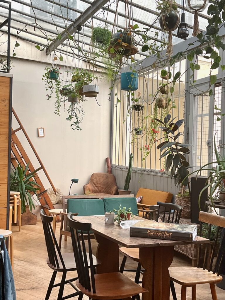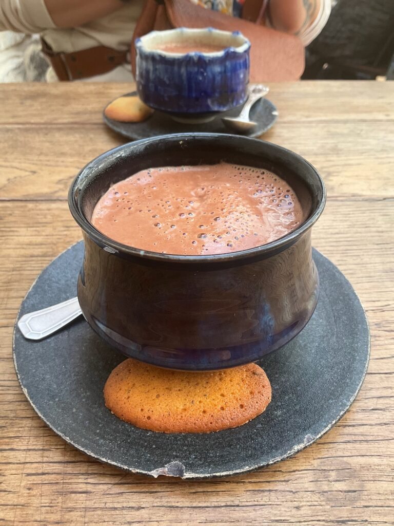 J’hésite un instant à goûter un thé vert à 36€ la tasse et me rabats plus sagement sur un chocolat Morropon du Pérou, à 72% de cacao. Il est si épais que la cuillère reste plantée dedans à la verticale, et si riche que je suis écoeurée au bout de la troisième gorgée bouchée. Sûrement un produit de qualité, mais pas ma came du tout. Isa en revanche semble se régaler avec le sien. Et j’apprécie tout de même le calme du lieu, sa déco végétalisée et les céramiques faites à la main. En passant à la caisse, j’achète une tablette 100% cacao appelée Darkness, pour Chouchou qui s’efforce d’éviter le sucre. Il y a aussi des confitures et des tartinades artisanales toutes très appétissantes.