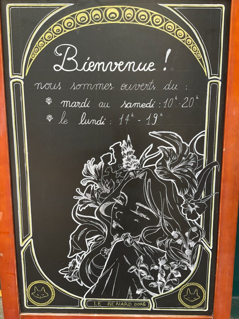 Un saut de puce en métro nous amène ensuite au Renard Doré où je fais l’acquisition de mes livres n°3 et 4 (en français, ceux-là), ainsi que d’un craquant petit requin en peluche. Puis nous rebroussons chemin jusqu’à Maubert-Mutualité et au Bistro des Lettres, où je nous ai réservé une table pour 12h30. J’ai bien fait d’être prévoyante, car lorsque nous arrivons, il ne reste qu’une table pour deux – la nôtre, dans un petit coin à peu près calme.