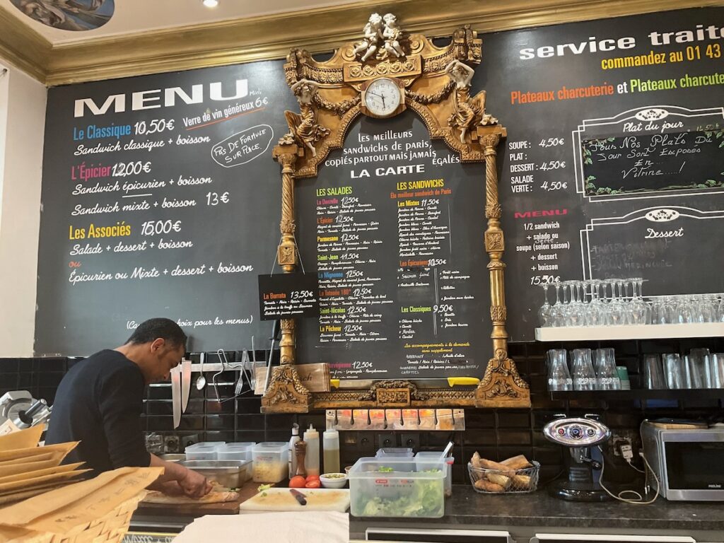 En remontant vers le métro, nous passons devant la vitrine d’un charcutier traiteur qui se vante de proposer « les meilleurs sandwichs de Paris, copiés partout mais jamais égalés ». Ca tombe bien: Isa a une soirée romance dans un bar à cocktails et n’est pas certaine qu’on la nourrira davantage qu’hier; quant à moi, je sais qu’une fois rentrée à l’hôtel, je n’aurai pas le courage de ressortir pour dîner. Je me fais donc confectionner un jambon blanc-fourme d’Ambert-courgettes, et elle un Brie-aubergines-tomates. Le monsieur qui tient la boutique est très sympa, et j’aime faire marcher le petit commerce.