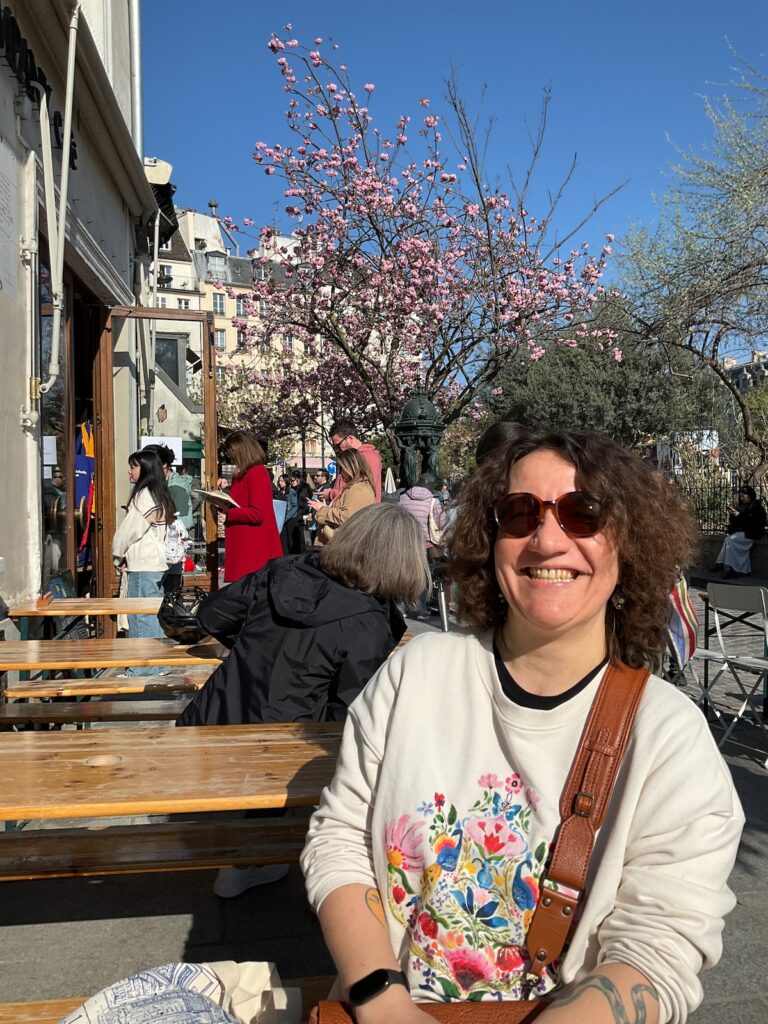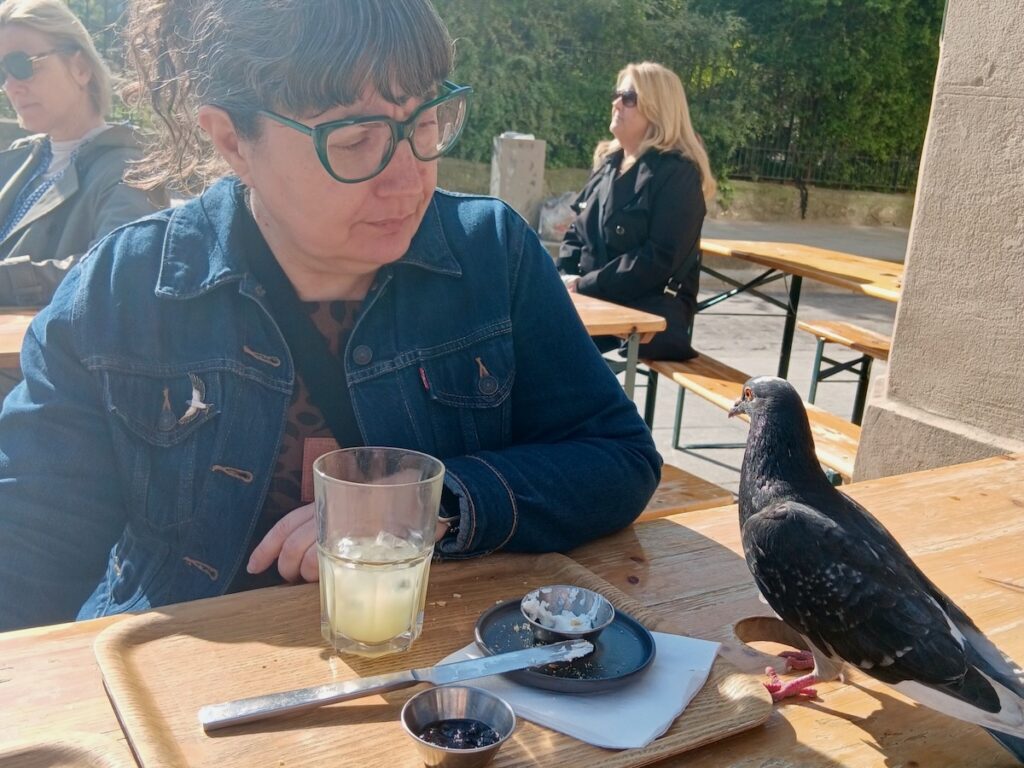 Nous prenons le métro jusqu’à Saint-Michel et marchons jusqu’à Shakespeare & Company. Nous petit-déjeunons en terrasse: golden latte pour Isa, limonade au gingembre pour moi, plus un scone raisins-cranberry et un autre au cheddar que nous partageons histoire de goûter les deux. Je n’ai pas plus tôt avalé la dernière bouchée qu’un pigeon effronté vient se percher sur notre table pour picorer tranquillement les miettes. Faut pas se gêner, surtout.