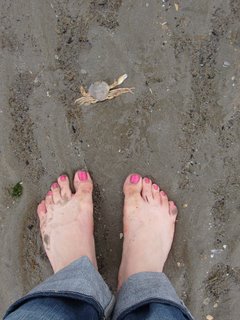 Ci-contre: mes pieds en compagnie d’un crabe belge mort.