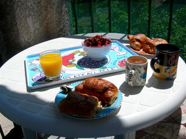 Commencé vendredi vers 16h30 à l’aéroport et fini dimanche 11h10 devant la gare. Nous n’avons eu qu’une journée complète à passer ensemble, mais nous avons réussi à y mettre beaucoup de choses.De longs câlins matinaux, ces moments délicieux où on fait l’amour encore à moitié endormis et qui semblent ne durer que quelques minutes de pure sensualité paresseuse alors que l’horloge égrène bel et bien des heures entières. Un lever tardif, suivi d’une préparation rapide (59,4 kilos dit ma balance, youpi!) et d’une descente à la « bonne boulangerie » du village: croissants, pains au chocolat, tartes aux fraises individuelles pour le midi – et tiens, une livre des premières cerises de la saison chez le marchand de primeurs voisin. Au retour, deux-trois photos à la sauvette sur les rails de chemin de fer. Petit déjeuner sur le balcon avec les chats qui tapent l’incruste, un moment de pur bonheur. Les oiseaux chantent, le ciel est d’un bleu idyllique, la chaleur tempérée par une brise primesautière et « mon » arbre veille sur nous. Table débarrassée, on s’installe dehors avec une rallonge et nos deux portables face à face. L’album de Mika sur iTunes pour les indispensables vitamines musicales du week-end. On surfe ou blogue chacun de son côté, en levant juste les yeux pour se sourire de temps en temps. L’univers file droit.