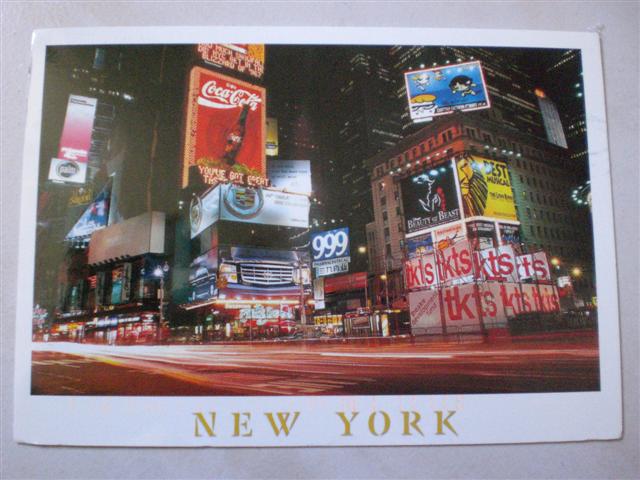 Apprenant que Soeur Cadette et sa petite famille partaient une semaine à New York, j’ai réclamé une carte postale parce que, chaque fois que je voyage à l’étranger, je me promets de m’en auto-envoyer une en souvenir, et au final je ne le fais jamais. Et puis la dernière carte que Soeur Cadette m’avait envoyée de Barcelone était une superbe mosaïque de détails des oeuvres de Gaudi qui m’avait tant plu que deux ans après, elle trône toujours sous le sous-main transparent de mon bureau. M’en remettant à son bon goût, j’ai donc demandé « quelque chose d’original, hein, pas une vue de la Statue de la Liberté ou de l’Empire State ».