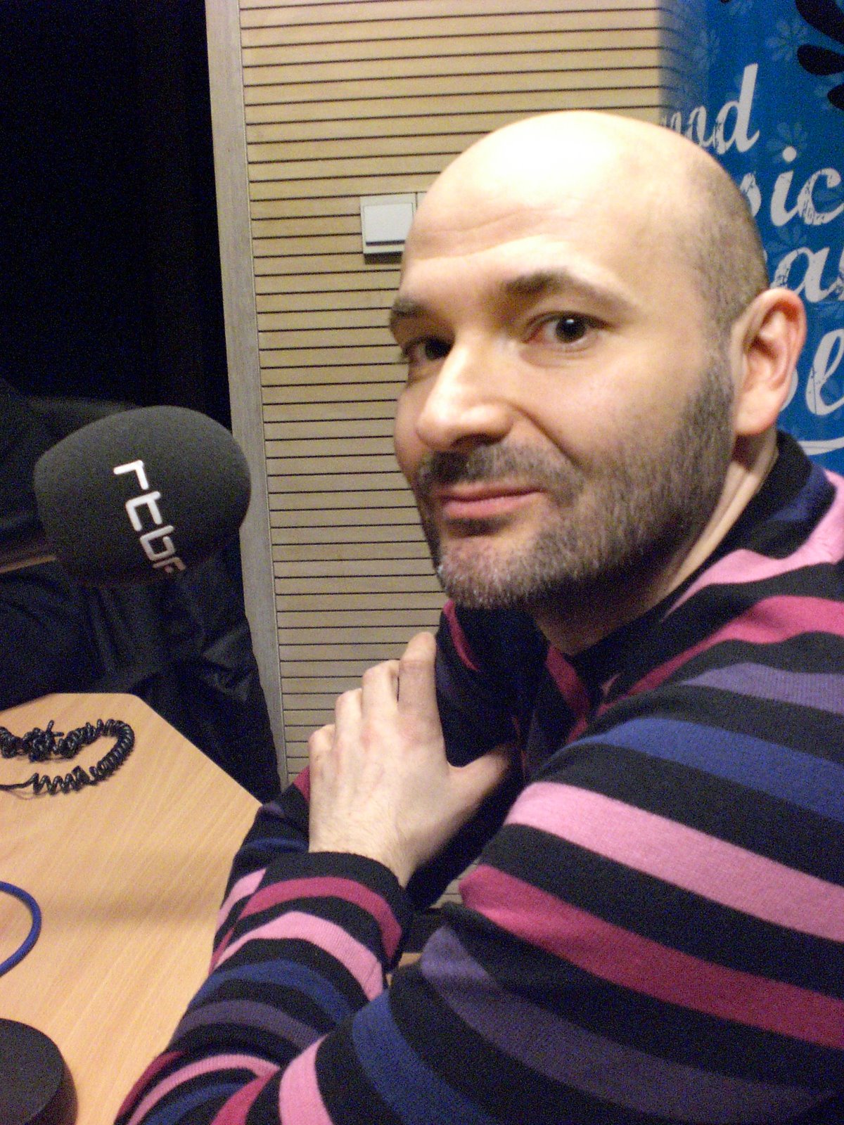 Muriel Dujardin est une fille à la fois douce et pétillante, du genre que l’on aimerait avoir pour amie. Elle était entourée hier par trois chroniqueurs. D’abord Gauthier, heureux propriétaire d’une belle voix de radio, juste basse et grave comme il faut pour inciter à la confidence (en même temps, ce n’est pas comme si j’avais besoin qu’on me pousse beaucoup de ce côté-là!). Puis Brice, que Hawk avait déjà croisé socialement chez un ami commun, et qui m’a fait l’effet du plaisantin de service, toujours prêt à dégainer un jeu de mots à deux balles ou une allusion coquine. Et enfin Thierry, ex-propriétaire d’un magasin de vidéos que Hawk fréquentait assidûment dans le temps. Comme quoi Bruxelles, c’est tout petit.Malgré une réunion de préparation durant laquelle Muriel nous avait interrogés sur notre histoire et notre blog photo Elle&Lui, je ne savais absolument pas à quoi m’attendre en arrivant dans le studio de Pure FM. L’ambiance était plutôt bon enfant: tout le monde autour d’une table encombrée de matos, bricolage de micros et de casques au dernier moment. On nous a posé des questions assez intimes auxquelles nous avons répondu, je crois, de façon sincère et pas trop chiante. Nous avons parlé bien davantage que ce que j’imaginais; en trois quarts d’heure, il n’y a eu que trois pauses d’une petite chanson chacune.