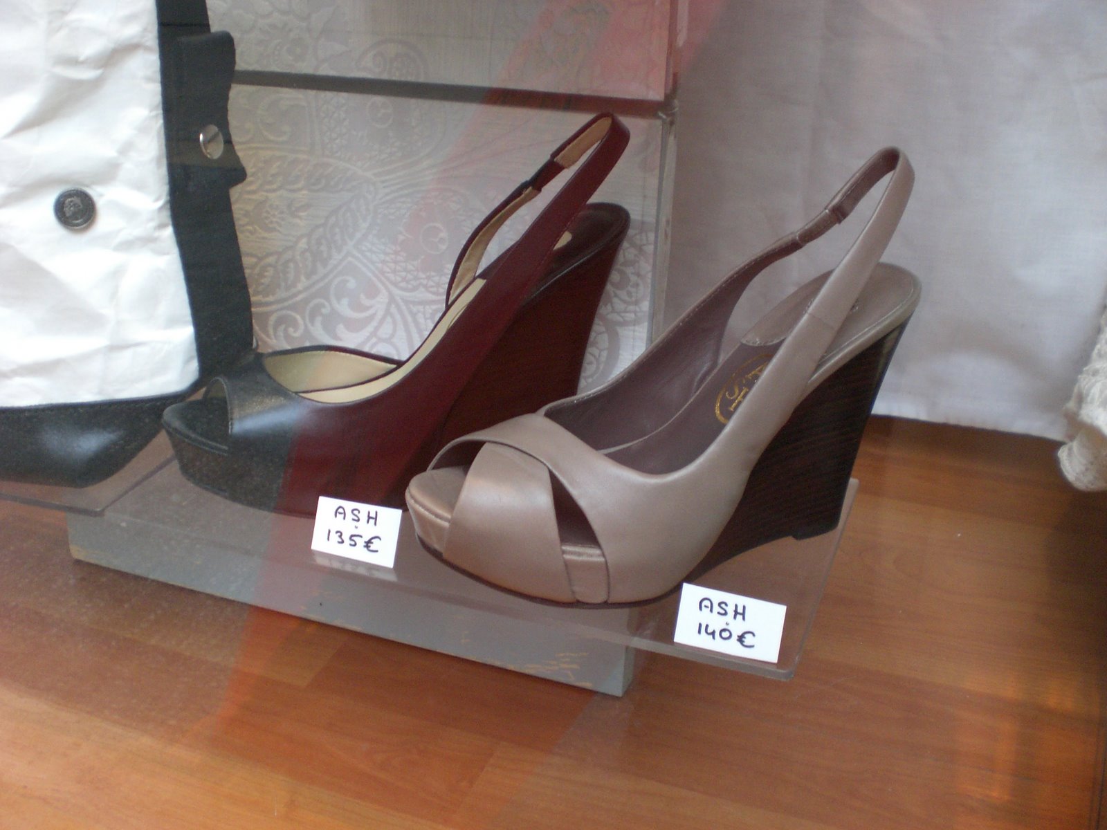 Je me suis pas mal calmée sur les achats de chaussures depuis mon arrivée en Belgique (le fait de ne jamais trouver ma pointure aide pas mal, même si ce n’est pas toujours un argument dissuasif). Jusqu’ici, 3 paires en bientôt 4 mois – on frisait l’héroïsme. Evidemment j’ai mis la première (escarpins en cuir vernis gris clair Mango) 1 fois, la seconde (sandales à bride en cuir vernis rouge Sacha) 2 fois et la troisième (escarpins en cuir bleu canard Sacha) pas encore, puisque ce sont toutes des pompes à talon fort peu pratiques pour déambuler dans les rues pavées de Bruxelles. Tout l’hiver, j’aurai porté les boots de moto Free Lance que je traîne depuis trois ans et les Sketchers noires à scratch payées $16 dans un magasin d’usine américain lors de mon avant-dernier voyage aux USA. Mais bon, si j’achetais des chaussures pour les porter ça se saurait, hein.Aujourd’hui cependant, c’était mon mercredi de shopping traditionnel de quand-je-suis-en-France. Et en plus j’avais un peu de sous sur mon compte en banque. Alors quand j’ai vu des compensées Ash idéales me faire de l’oeil dans la vitrine d’un premier magasin, je me suis dit que c’était peut-être un peu tôt pour investir dans des pompes d’été. Quand je les ai revues dans la vitrine d’un second magasin cent mètres plus loin, j’ai regardé l’étiquette en faisant mentalement mes comptes jusqu’à la fin du mois et en décidant de temporiser. Quand elles m’ont sauté à la figure dans la vitrine d’un troisième magasin en plein centre commercial, j’ai pensé que l’univers m’envoyait un message.