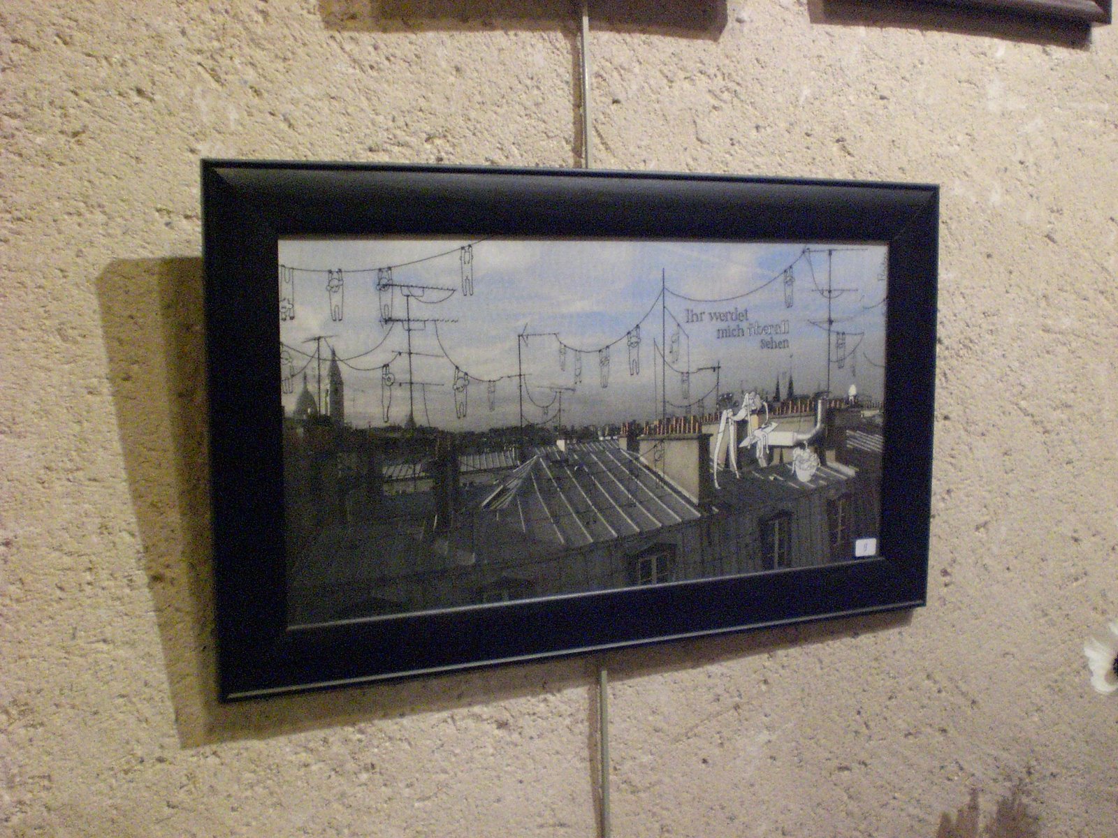 Bref, revenons au sujet de ce post: l’expo. Pas plus d’une douzaine d’oeuvres pour chacun des trois artistes. J’avoue que le travail de Jérômeuh m’indiffère. Je ne suis pas non plus fan de Cha, mais le tableau d’elle accroché en vitrine (deux amoureux sur une toile lacérée et recousue au point croisé, dans des tons de rose et de rouge, avec l’inscription « Love kills ») m’a beaucoup plu. Quant aux collages de Pénélope, ses planches naturalistes m’ont laissée un peu perplexe; par contre j’ai eu le coup de foudre pour une photo des toits de Paris sur laquelle elle a rajouté plein de cordes à linge avec de petits enfants tout plats en train de sécher, et dans un coin une jeune femme en sous-vêtements en train d’en repasser d’autres d’un air concentré. Je me suis précipitée vers le comptoir en égratignant quelques mollets supplémentaires au passage. « Trop tard, elle est déjà vendue », m’a dit le propriétaire de la galerie. J’étais super déçue. Ca faisait longtemps que je n’avais pas acheté de tableau parce que je ne trouvais rien qui me touchait, et j’aurais vraiment aimé accrocher celui-ci sur les murs de notre appartement bruxellois.