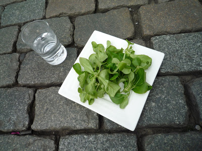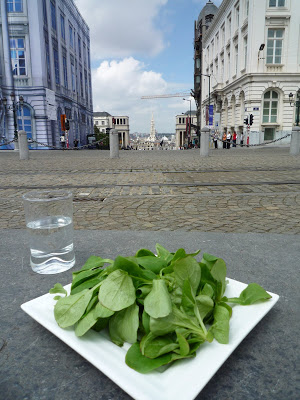 12h30: L’estomac lesté, nous nous dirigeons d’un pas considérablement ralenti vers la Grand-Place où nous espérons profiter de l’heure du déjeuner et de la baisse d’affluence touristique pour mettre en scène notre « verre et verdure ». Manque de chance, nous tombons en plein mariage. Sûrement quelqu’un d’important, car l’accès de la place a été, chose rare, autorisé aux voitures parmi lesquelles une immense limousine. Nous devons renoncer à inclure les bâtiments alentour dans nos clichés. Sans me décourager, je décide de prendre une photo toute simple de nos accessoires sur les pavés si caractéristiques de Bruxelles. Les gens qui passent à côté de nous se marrent, voire nous photographient ou nous filment. Ce soir, la moitié de la ville parlera des deux cinglés qui mitraillaient une assiette de salade au milieu de la Grand-Place.