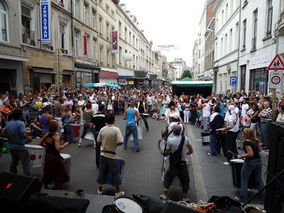 Tout à l’heure en remontant à pied depuis Filigranes, nous sommes tombés par hasard sur un groupe de percussionnistes qui jouaient au milieu de la Chaussée d’Ixelles devant une foule assez nombreuse. Bien qu’un peu grognon, je n’ai pu m’empêcher de m’arrêter pour les écouter et les regarder. Quinze ou vingt jeunes, Noirs, Blancs ou à mi-chemin entre les deux, filles et garçons mélangés, cognaient sur des tambours d’aspect bricolé avec un enthousiasme contagieux, dirigés par un « chef d’orchestre » aux impressionnantes gesticulations. Un joli moment de métissage et d’énergie.