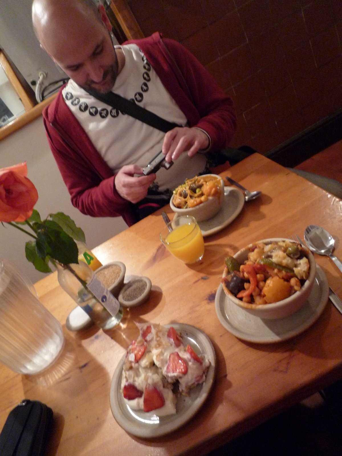 Cette fois, néanmoins, j’ai eu de la chance. Non seulement le Food for Thought était toujours là, mais mon fameux scrunch figurait encore au menu pourtant assez restreint! J’ai commandé, pour l’accompagner, un ragoût espagnol à base de pois chiches, d’aubergines, de tomates, de pommes de terre et de fromage de chèvre – un pur régal -, tandis que Hawk optait pour le tofu aux légumes. Pour une fois, il n’y avait pas la queue dans l’escalier et à travers la moitié de la rue; nous avons même réussi à dénicher une table pour quatre à laquelle personne d’autre n’est venu squatter avant notre départ. Après une matinée de shopping en demi-teinte, ce repas est arrivé à point pour me rasséréner. Si on m’avait dit qu’un jour, la bouffe serait ma principale source de satisfaction lors d’un séjour à Londres, je ne l’aurais pas cru; et pourtant…Sauf exception, les commentaires sont désactivés. Si vous voulez poursuivre la conversation, je vous invite à le faire sur la page Facebook du blog.