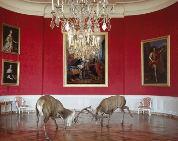 L’expo, maintenant. Elle part plutôt bien, avec une série de photos montrant des chimpanzés dans un musée désert à l’exception de très belles statues de nus en marbre blanc. On peut y voir une réflexion sur le concept d’évolution, ou juste la superposition incongrue d’animaux sauvages avec un endroit auquel ils ne sont pas censés accéder – le comble du raffinement de la culture humaine. Mais ensuite… Ce ne sont plus que clichés de bestioles empaillées mises en scène dans différents châteaux: des loups et des dorures; des oiseaux et des tapisseries; des sangliers et des planchers en marquetterie. Et, tiens, une femme à poil allongée par terre près d’un cygne. Le pire, c’est qu’on voit bien que dans la plupart des cas, les animaux ont été rajoutés dans le décor à grands coups de Photoshop. En gros, ce n’est remarquable ni dans la technique, ni dans l’intention, ni dans l’atmosphère créée.