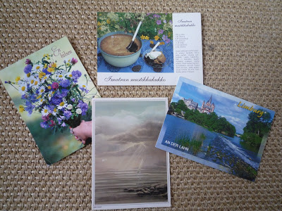 Dans ma boîte à lettres aujourd’hui: une carte venue d’Allemagne, deux de Finlande et une de Norvège. Pas d’illustrations remarquables dans le tas, mais une recette de tourte aux myrtilles que je serais bien en peine d’exécuter faute de lire le finlandais. Et des timbres tous jolis, avec une mention spéciale pour le Finlandais qui représente un gâteau entouré de framboises.