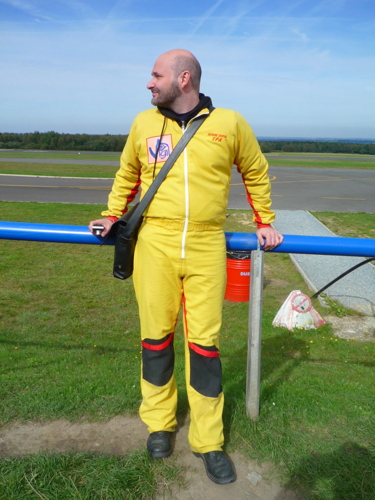 Les opérations ayant pris un peu de retard, c’est finalement vers 14h qu’un grand type blond et bronzé, affichant un beau sourire Pepsodent et répondant au prénom d’Yves, s’avance vers moi en me tendant la main. Il court partout quelques minutes avec son caméscope à la main, puis ajuste mon harnais par-dessus la combinaison frites-ketchup jaune et rouge que j’ai déjà enfilée toute seule comme une grande. Je rentre mes cheveux dans le col de mon sweat, remonte la fermeture éclair de la combi jusque sous mon menton, essaye les lunettes en plastique par-dessus les miennes et me déclare parée.