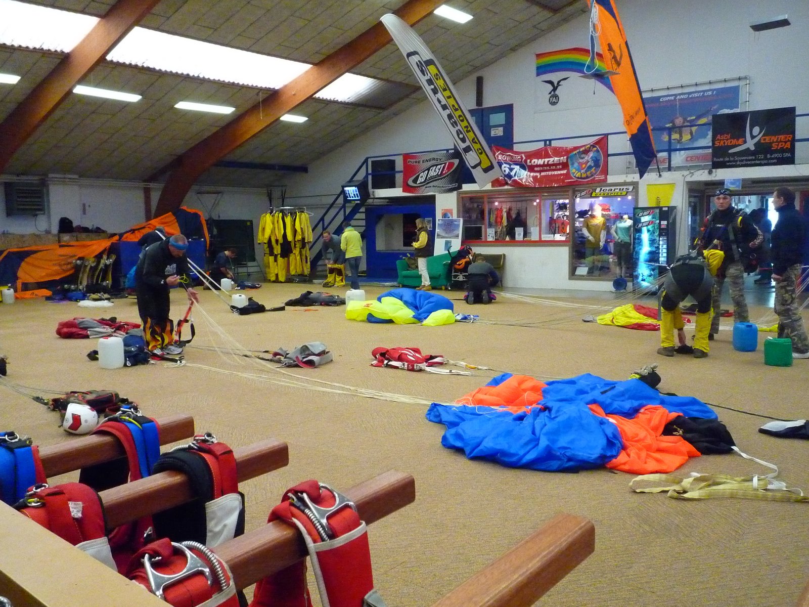 Nous nous sommes engouffrés dans le Skydive Center, beaucoup plus grand que je ne l’imaginais et bourdonnant d’activité. Des dizaines de parachutistes amateurs ou chevronnés attendaient leur tour d’embarquer. Nous avons localisé l’accueil situé dans le fond et nous sommes précipités pour signaler notre arrivée. Au final, il n’y a eu aucun problème: nous nous sommes juste retrouvés affectés à la dernière fournée de clients qui avaient rendez-vous à 11h30. Saut prévu vers 13h40. En attendant, un jeune homme blond qui semblait avoir quatorze ans et demi nous a fait le briefing. J’ai été très rassurée d’apprendre qu’au cours d’un saut en tandem, le novice était totalement assisté par son instructeur du début jusqu’à la fin. Pas d’hésitation possible, donc, au moment de se jeter dans le vide. A partir de l’instant où j’ai su cela, j’ai attendu l’heure du saut avec une telle excitation que je n’ai même pas réclamé à déjeuner (les gens qui me connaissent IRL apprécieront à sa juste valeur la gravité de l’événement).