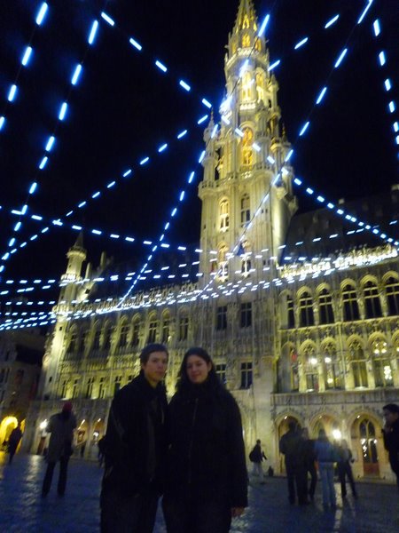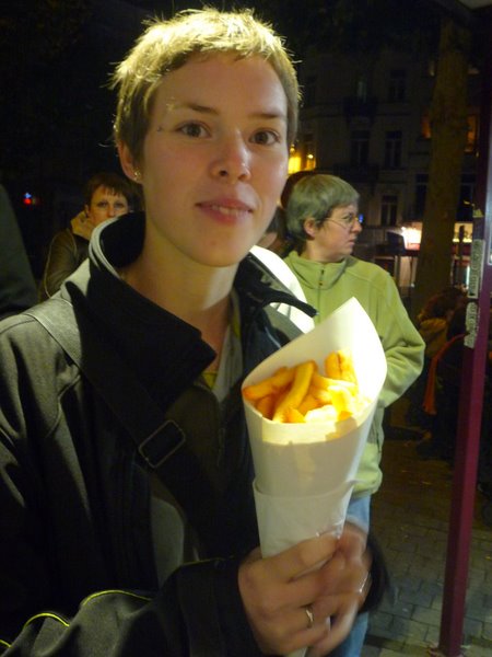 Après un rapide tour dans le centre-ville (passage obligatoire par la Grand’Place dont l’éclairage actuel, bien que pas vilain, gâche quelque peu les photos), le froid nous a poussés à nous replier vers les Galeries Royales. Chouchou et moi espérions nous installer au Vaudeville pour, tranquillement au chaud, faire goûter à nos invitées les spécialités locales: bière et cornet de frites. Malheureusement, à cause d’un banquet, la salle était déjà pleine. Nous avons alors eu l’idée de nous replier vers la place Jourdan et « Chez Antoine » qui, même s’il m’avait déçue lors de ma première visite, reste quand même un des plus célèbres fritkot de Bruxelles – et, paraît-il, le seul construit en dur. Pour changer un peu, la file d’attente n’avançait pas, ce qui nous a donné l’occasion de causer blogs et loisirs. Marine ayant mentionné qu’elle avait très envie de tester la Wii Fit, nous avons une fois de plus changé nos plans. Au lieu de nous installer dans un des cafés de la place, nous sommes remontés à la maison, distante de moins de 500 mètres, avec nos cornets de frites et nos poulycrocs bien emballés dans un sac plastique. Le temps de débarrasser les ordinateurs, et nous nous sommes installés tous les quatre autour de la grande table avec des verres de Coca light pour arroser notre cholestérol en bâtonnets.