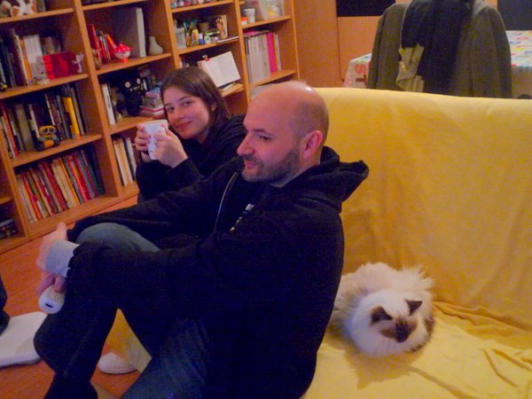 Puis nous avons sorti la Wii Fit. C’est toujours très drôle de voir des gens s’en servir pour la première fois, même si je dois avouer que Marine s’en est bien mieux sortie que nous en avril. Yuna, elle, a préféré observer depuis le canapé en sirotant un thé du Hammam. Chouchou et moi nous sommes tous deux fait la réflexion que c’était des filles très différentes. A cause, sans doute, de mes propres expériences malheureuses en la matière, je suis toujours surprise et épatée de voir durer ce genre de relation – celui dont les partenaires se complètent au lieu de se ressembler et, bien que n’ayant ni le même caractère ni les mêmes goûts, arrivent néanmoins à trouver un terrain d’entente où être heureux ensemble. Le moment venu pour les filles de regagner Anderlecht où elles sont logées par des amis de Marine, nous avons appelé Cambio pour savoir si, par hasard, il n’y aurait pas une voiture de disponible à la station la plus proche de chez nous. Il y avait, hourra! J’aurais trouvé ça cruel de les laisser rentrer seules en métro avec le ventre plein de frites et le froid qu’il faisait dehors. Nous avons donc pu les raccompagner et les laisser devant leur domicile temporaire en leur souhaitant une bonne fin de vacances. Vive Cambio, vive la Wii Fit, vive les frites, vive nous.