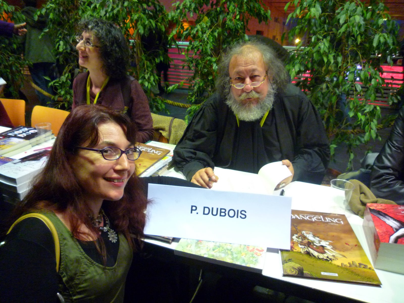 Douze ans plus tard, Pierre Dubois n’a pas changé. Il a toujours le crâne dégarni sur le dessus, le cheveu gris mi-long et frisottant, le regard pétillant de malice derrière ses petites lunettes à monture métallique et une silhouette de bon vivant drapée dans une longue robe noire. On s’attend presque à ce qu’il se serve d’un bâton en bois noueux couvert de runes pour s’aider à marcher. Il tutoie toujours spontanément les gens qui viennent lui demander des dédicaces et prend le temps de converser avec tous ceux qui en manifestent l’envie. Nous l’avons mobilisé un moment: moi en lui faisant signer son superbe Dragons et chimères: carnets d’exploration et en lui disant de nouveau ma déception que sa série Pixies se soit arrêtée prématurément, Gren en lui rappelant toutes les autres occasions dans lesquelles leurs chemins s’étaient déjà croisés et la réponse manuscrite qu’il avait faite à une de ses lettres. Avant de partir, elle s’est débrouillée pour lui voler deux bises et s’est éloignée, rose de bonheur, en affirmant qu’elle ne se laverait plus jamais les joues. Leonard Cohen, Pierre Dubois: les septuagénaires ont la cote avec nous!