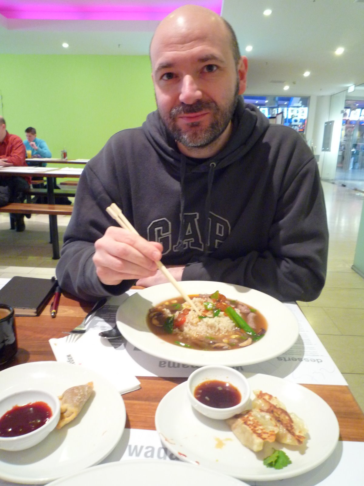 Le câlin matinal ayant quelque peu rogné sur notre temps de préparation, c’est en courant à moitié sur les pavés gelés que nous descendons jusqu’à la gare centrale prendre le train de 11h19 pour Anvers. Quarante minutes plus tard, nous débarquons dans une gare aussi jolie que venteuse où, malgré nos écharpes et nos gants, nous congelons pratiquement sur pied en tentant de gagner la bonne sortie. Selon la Google Map imprimée par Chouchou, la boutique Lush devrait se trouver juste en face. Sauf que non. Et que nous ne voyons nulle part de panneau indiquant le nom des rues. Nous partons un peu au hasard sur une avenue qui semble engageante et tombons sur… le Wagamama, qui devait être notre second arrêt. Pas grave, nous n’avons pas eu le temps d’avaler quoi que ce soit ce matin et mangerons volontiers tout de suite. Je suis déçue de ne pas retrouver sur la carte le plat de saumon qui m’avait tant plu à Copenhague. Je me rabats sur des yasai udon précédés de gyoza (mon péché mignon dans la cuisine japonaise). Le plat arrache un chouïa, et bien que j’en laisse un peu dans mon assiette pour cause d’estomac plein, je commande un dessert à partager avec Chouchou histoire de ne pas rester sur ce goût trop pimenté. Malheureusement, le chocolate fudge cake est parfumé au gingembre, un condiment que j’exècre. J’en grignote quand même quelques bouchées avec de la glace à la vanille.