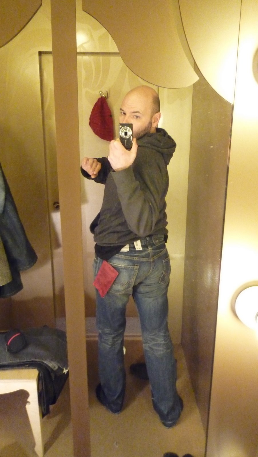 Nous nous engageons ensuite sur le Meir, la principale artère commerçante d’Anvers. Chouchou ne m’a pas dit que du bien des Flamands et de leur attitude envers les non-néerlandophones, mais une chose est certaine: cette ville est ravissante, un vrai régal pour les yeux. Dommage que le froid de canard n’incite guère à s’arrêter tous les trois pas pour ôter ses gants et mitrailler les bâtiments. L’arrêt suivant est pour le magasin Urban Outfitters, une marque que nous adorons tous les deux depuis que je l’ai faite découvrir à Choucou à Londres fin juillet, puis à Copenhague en septembre. Au terme d’une trèèèèès longue attente devant les cabines d’essayage, Chouchou repart avec un jean à… 99 euros – mais qui en coûtait le double à l’origine. J’ai flashé sur le modèle, et il paraît qu’il lui va comme un gant. Il me le fait vérifier avec les photos qu’il a prises en se contorsionnant devant un miroir: ah ouéééé. Vendu. Pendant ce temps, j’ai fait le tour des rayons femme et déniché une géniale capeline en feutre kaki qui sera parfaite pour la mi-saison, ainsi qu’un T-shirt un peu graphique, pas soldé hélas et que je dois prendre en L car le M me serre trop sur la poitrine (gni? mes seins se seraient-ils enfin décidés à pousser? mieux vaut tard que jamais, hein).