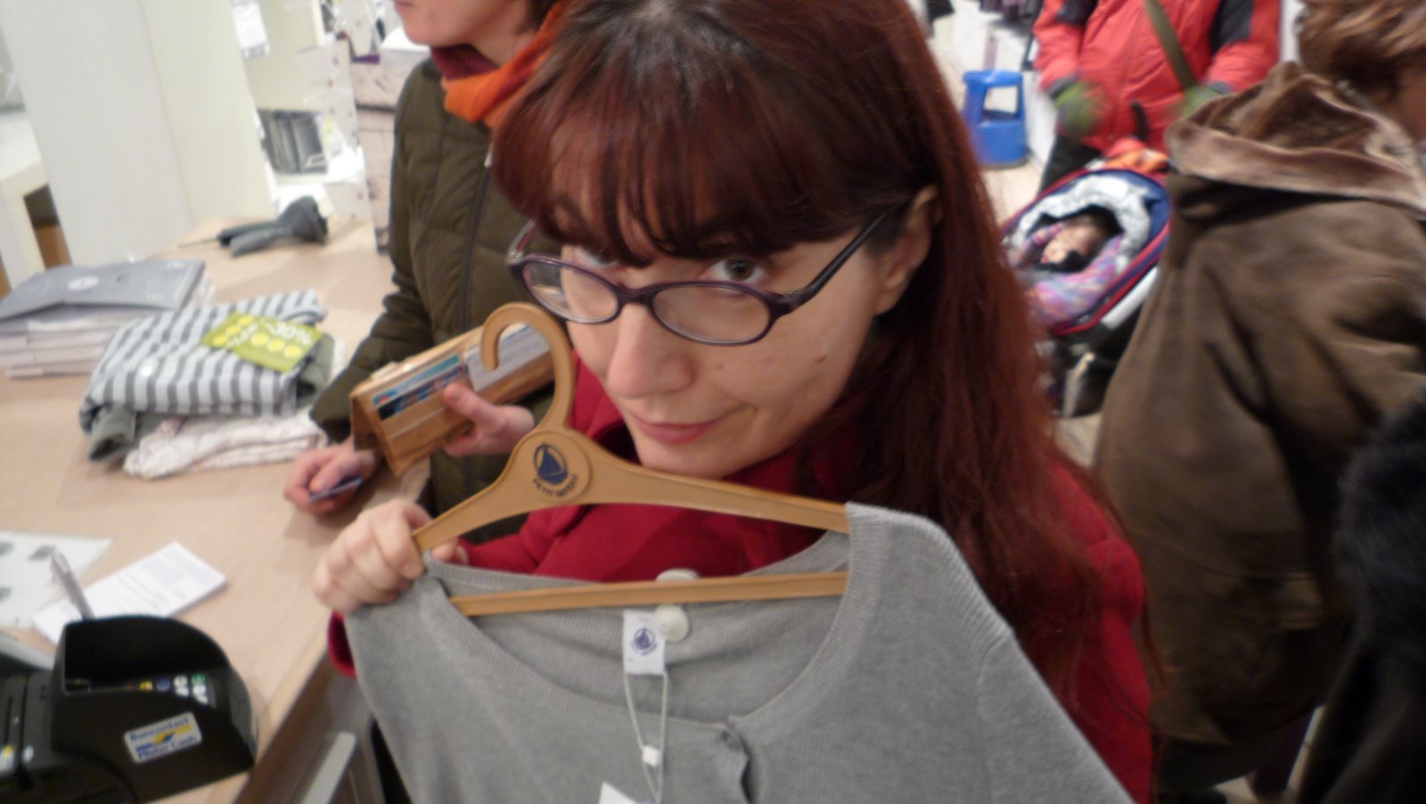 Avec tout ça, notre budget en a pris un sérieux coup dans l’aile. Nous décidons de zapper la boutique Kiehl’s, puisque nous avons déjà de quoi chouchouter notre peau pendant les trois ou quatre ans à venir, et Annemie Verbeke puisque j’en suis désormais à trois nouveaux cachemires cette semaine. Côté déco-gadgets, Mat & Rob, dont j’avais pris l’adresse dans un numéro de GAEL datant de 2007, a disparu. Quant à Akotee, elle ne tient pas les promesses du Elle Belgique (sans compter l’épouvantable odeur de pieds qui règne dans la minuscule boutique, une torture pour mon nez sensible). Je marque tout de même un dernier arrêt chez Petit Bateau où, avec Soeur Cadette, j’avais repéré de chouettes pulls d’intérieur en coton/soie/fibres de bambou, que je m’étais retenue d’acheter à cause de leur prix un chouia prohibitif. Là, ils sont soldés à -50%, et il y a ma taille (14 ans…). Pas d’hésitation, j’en embarque un.