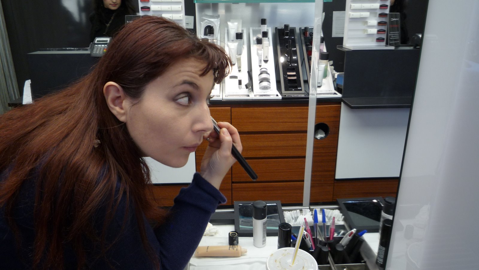 Enfin, en arrivant sur la question du blush (que, rien à faire, je ne peux pas me résoudre à poser comme elle préconise, c’est-à-dire sur le dessus de la pommette en étirant vers les tempes), j’ai réalisé que depuis toujours je faisais un mauvais usage du mien: je m’en servais dans le seul but de « creuser » mes joues trop rondes à mon goût. Pour ça, Vivika m’a montré un truc beaucoup plus efficace et au rendu merveilleusement naturel: l’utilisation d’un deuxième fond de teint un poil plus foncé que la peau, posé le long de l’os de la pommette et soigneusement blendé avec l’autre. Le résultat était hyper subtil et faisait vraiment un monde de différence.