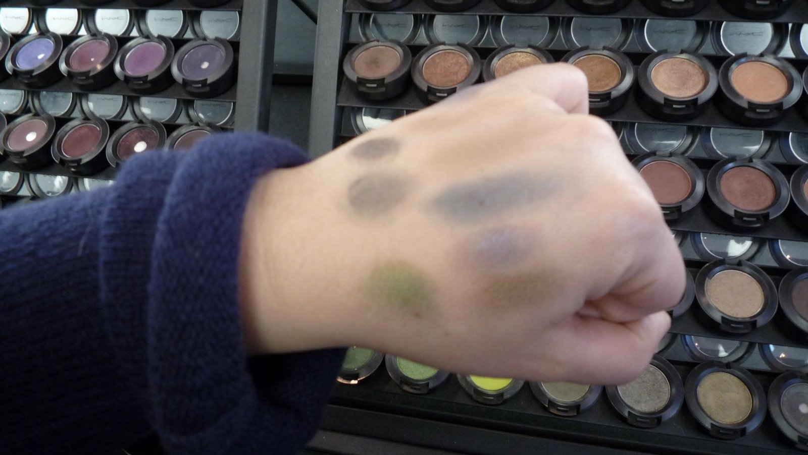 Avant de partir, j’ai bien évidemment fait une razzia dans la boutique: le pinceau 190 pour le fond de teint, le fond de teint en stick pour creuser mes pommettes (le fond de teint liquide que Vivika avait utilisé sur le reste de mon visage était parfait pour moi, mais j’en ai déjà trois flacons entamés et je venais d’acheter un Avène la veille, pour tester), une base visage et une base paupières, plus quatre fards à paupières: Naked Lunch, un beige rosé, Satin Taupe, un marron très doux qui fait paraît-il partie des best sellers de la marque, et puis le French Cuff et le Henna de la collection Brunette/Blonde/Redhead qui venait d’arriver en magasin la veille. Sublimes, juste sublimes. Mais uniquement vendus en petite boîte, ce qui va m’obliger à les dépoter suivant la technique d’Hélène pour les mettre dans ma palette.