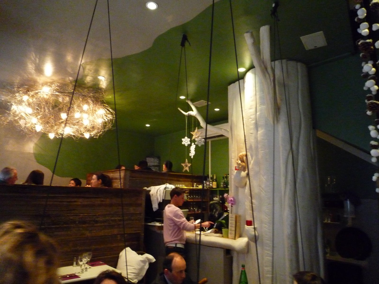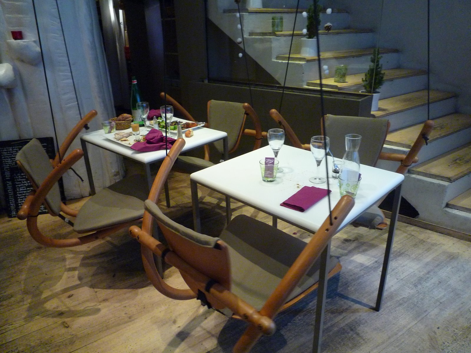 – la déco qui consiste en fait en un pauvre faux arbre planté près du comptoir de l’accueil, quelques parois de planches et des balancelles hyper mal placées, juste entre la porte et le comptoir, pile sur le chemin des serveurs et des clients qui arrivent ou repartent.