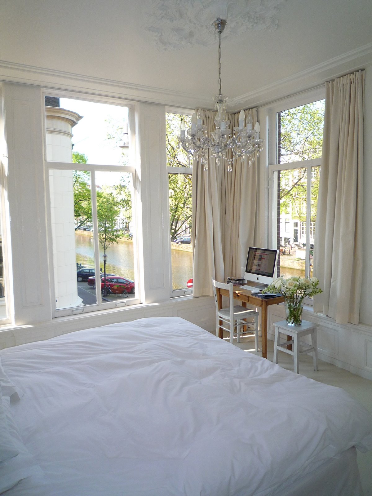 – La White Room pleine d’un charme discret, avec ses fenêtres donnant sur les canaux et son beau bouquet de roses blanches toutes fraîches.