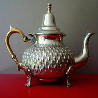 -La théière ancienne que j’ai rapportée de Marrakech. Repérée dans les souks dès le premier jour. Le vendeur en voulait 350 dh. J’ai fait la moue, « Moui moui je repasserai peut-être ». Et je suis effectivement repassée le dernier jour, où je ne me suis pas donné trop de mal pour la descendre à moins de 250 dh vu qu’il me restait du liquide à écouler. Sans compter que j’ai payé plus cher que ça des modèles qui avaient beaucoup moins de caractère, et qu’elle plaît aussi beaucoup à Chouchou. Par contre, je ne pense pas qu’elle possède le pouvoir magique de préparer du thé à la menthe correct qui ne contienne pas douze millions de calories le dé à coudre. C’est triste.