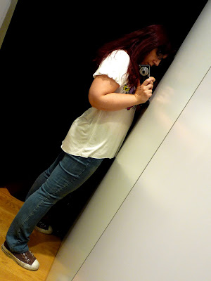 J’en ai marre de voir ma bobine, alors voilà, je me cache. Et j’en profite pour montrer comment il est joli, mon T-shirt Mango plus long derrière que devant. J’adore prendre des poses devant les miroirs des cabines d’essayage; les vendeuses doivent se demander ce que je fous là-dedans pour y rester aussi longtemps à chaque fois.