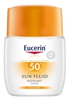 – Le Sun Fluid Matifiant SPF 50 d’Eucerin. Enfin un écran total qui pénètre vite, sans laisser le visage blanc et collant. De plus, le petit format du flacon et son bouchon à vis font qu’on peut le glisser sans crainte dans un sac à main pour s’en remettre régulièrement au cours de la journée. Comme diraient Leo et un paquet de copieurs: « Hallelujah! ».