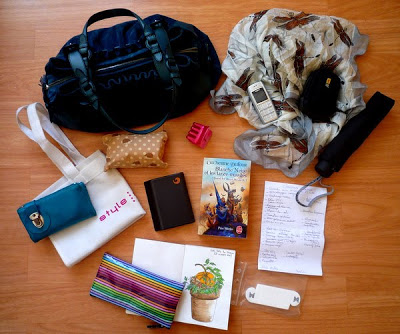 Mon sac n'est pas tellement digne d'intérêt mais je note l'idée du "livre de sac" (déjà,l'expression est chou),à condition que je parvienne à lire 2 bouquins en même temps sans perdre le fil (1"livre de maison" et 1 "livre de sac"),j'ai déjà essayé,j'ai un peu de mal.J'ajouterai un "livre de voiture"…ah ben non en fait,ce ne serait pas bien prudent…. ;-))